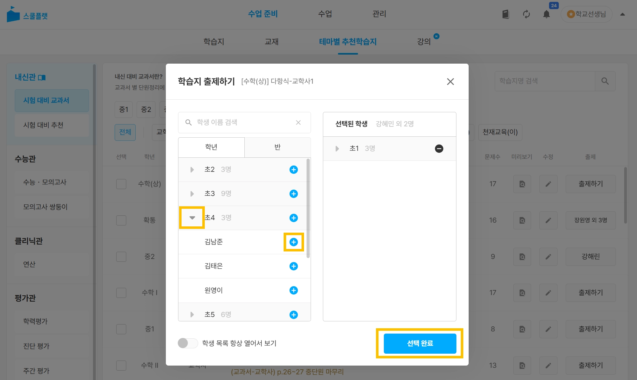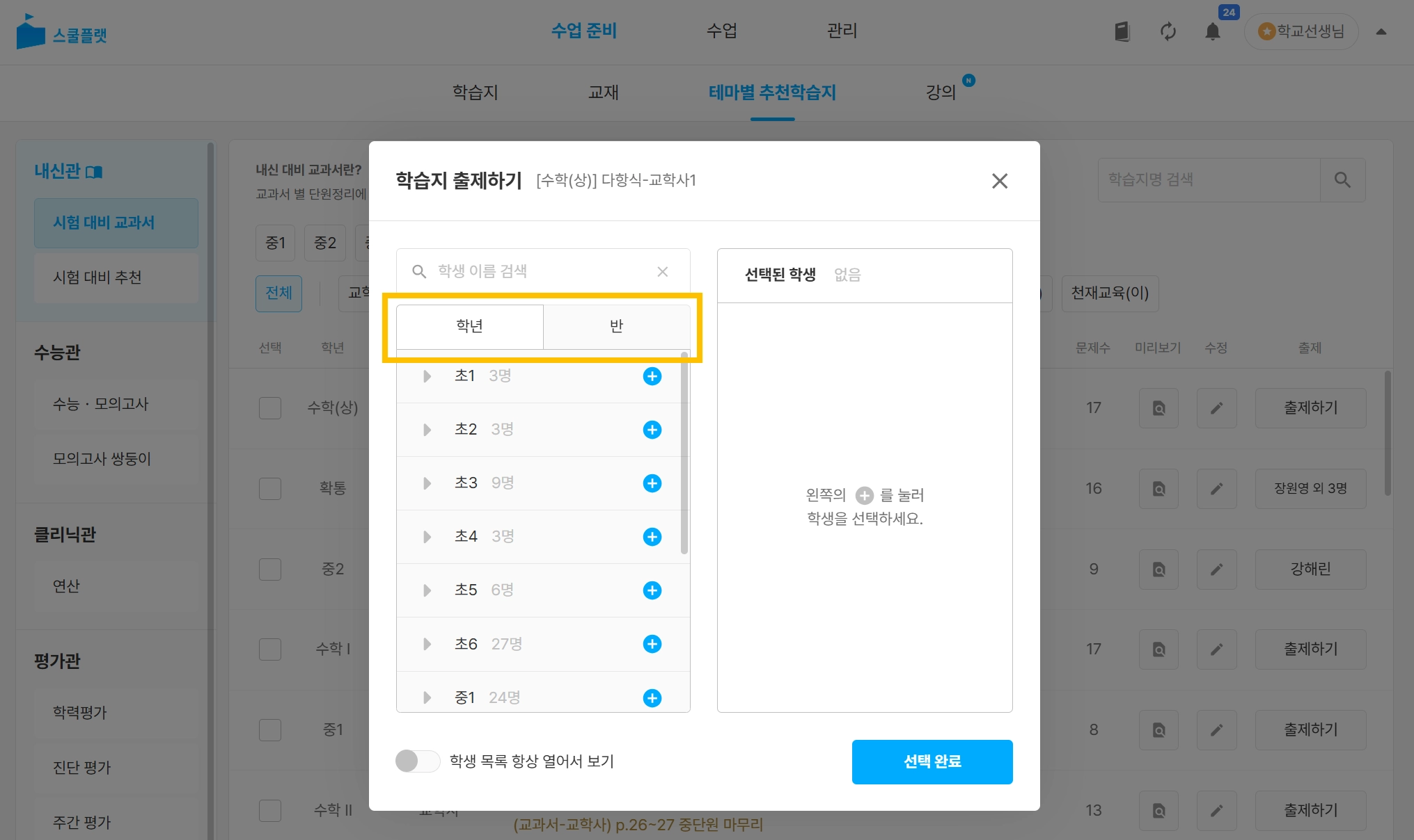 학년탭을 선택하면 학년별로 원하는 학생에게 출제가 가능합니다.