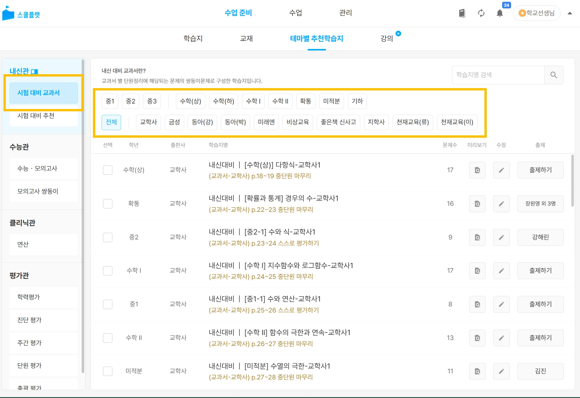 [수업 준비] - [테마별 추천학습지] - [시험 대비 교과서 학습지]탭에 들어옵니다.