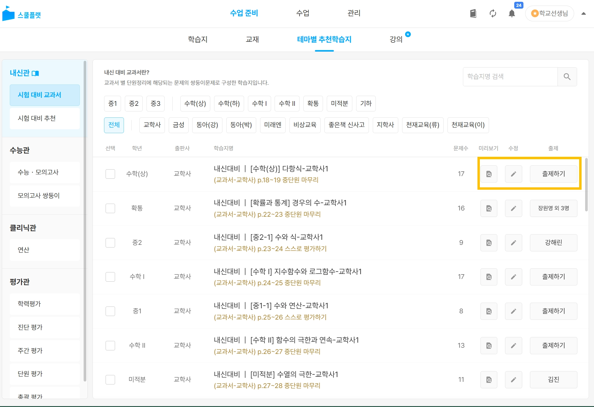 출제된 시험 대비 교과서 학습지의 n명(출제한 학생수) 버튼을 누르면 출제하기 팝업이 뜹니다.