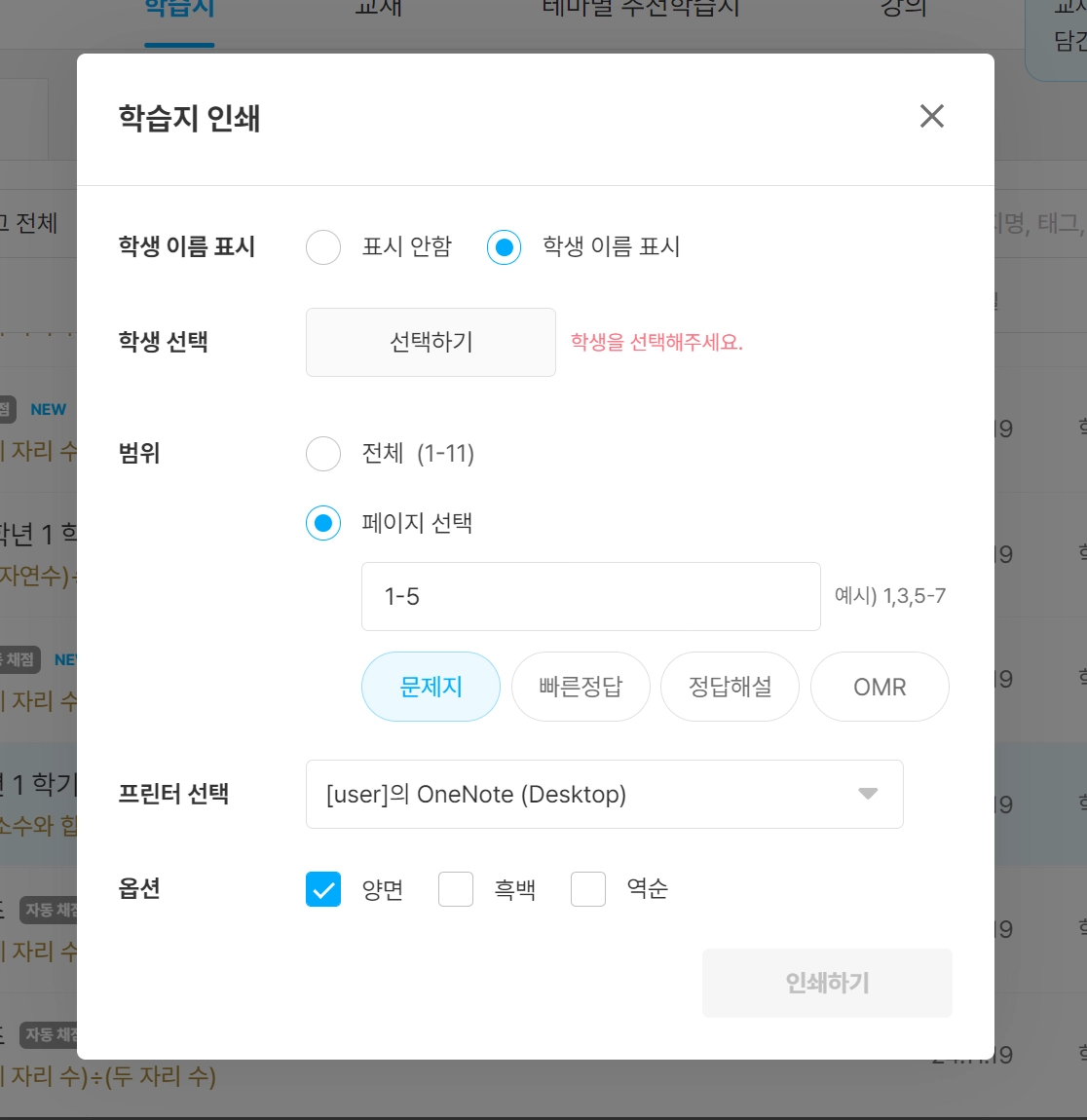 전체 선택 시 학습지 전체가 인쇄됩니다.