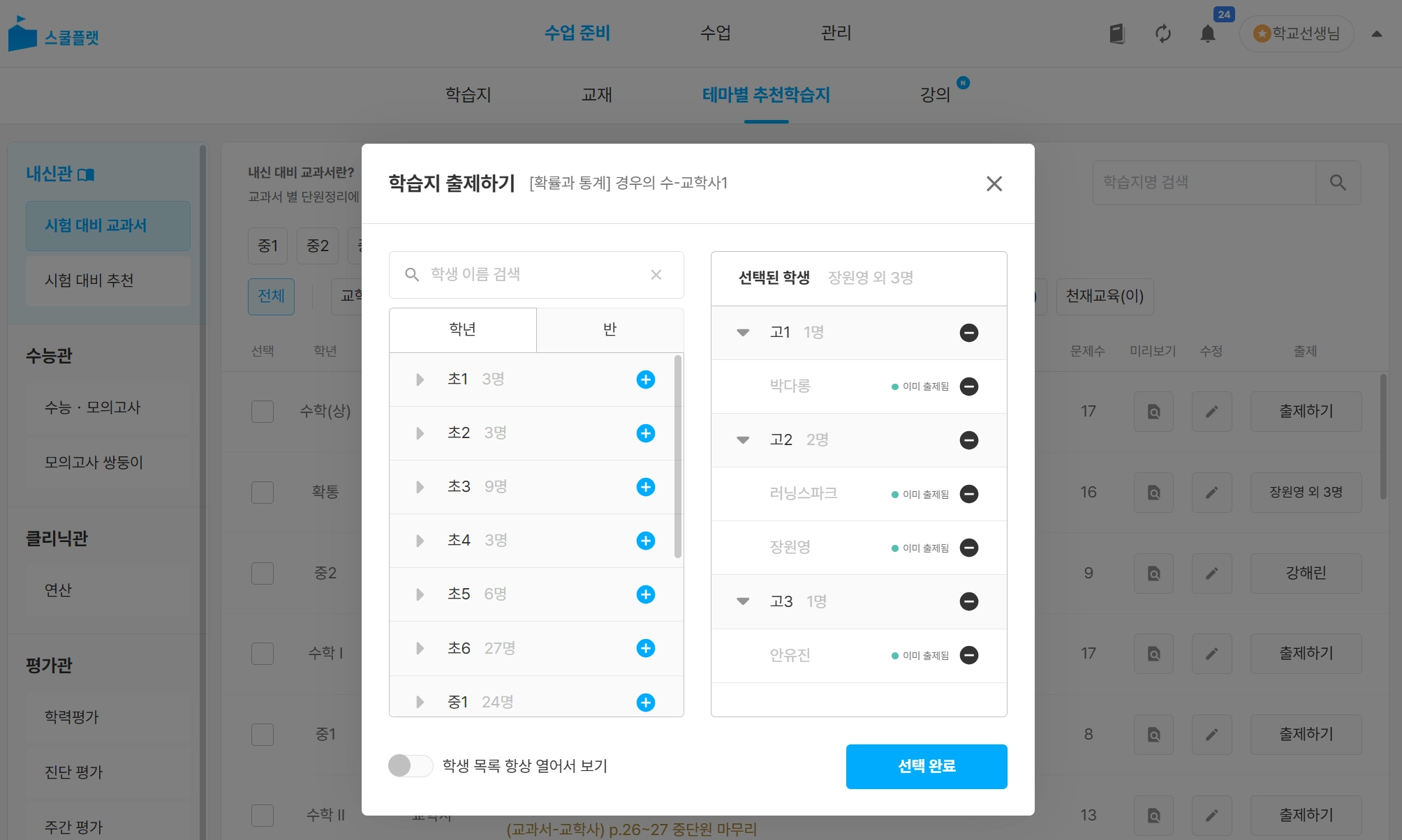 학생을 모두 추가했다면 선택 완료를 눌러 출제를 마칩니다.