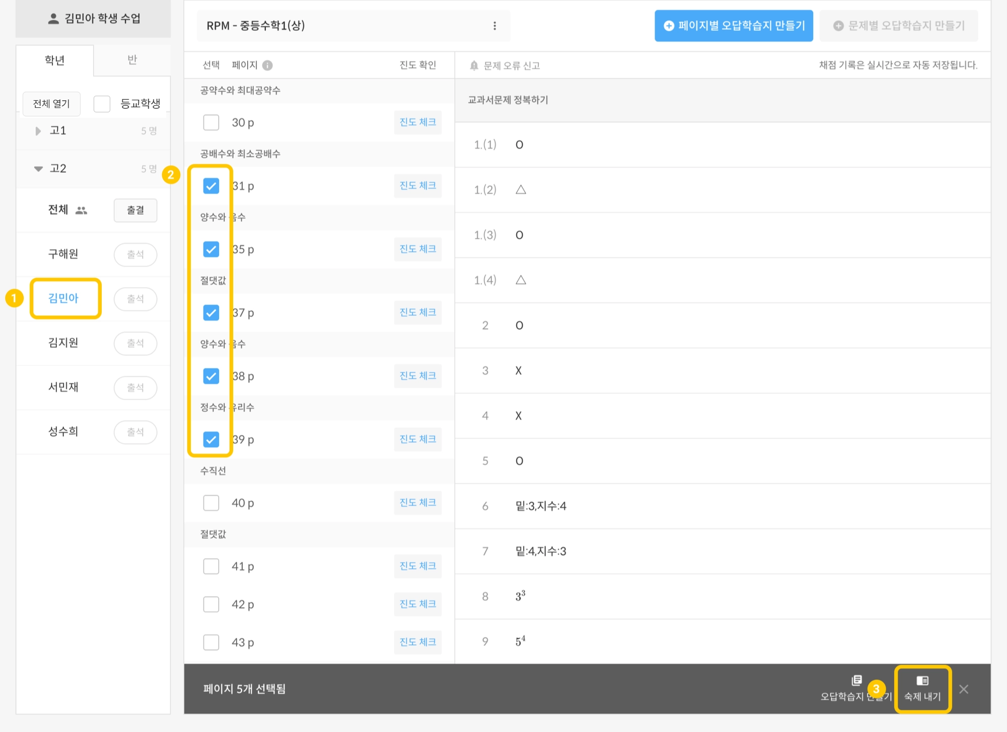 숙제내기 기능을 통해 학습지 또는 교재를 바로 학생에게 공유할 수 있고, 채점 시간을 줄일 수 있습니다. 또한 학습 내역에서 매일 매일 학생이 숙제로 어떤 학습지와 교재를 풀었는지 확인할 수 있습니다.