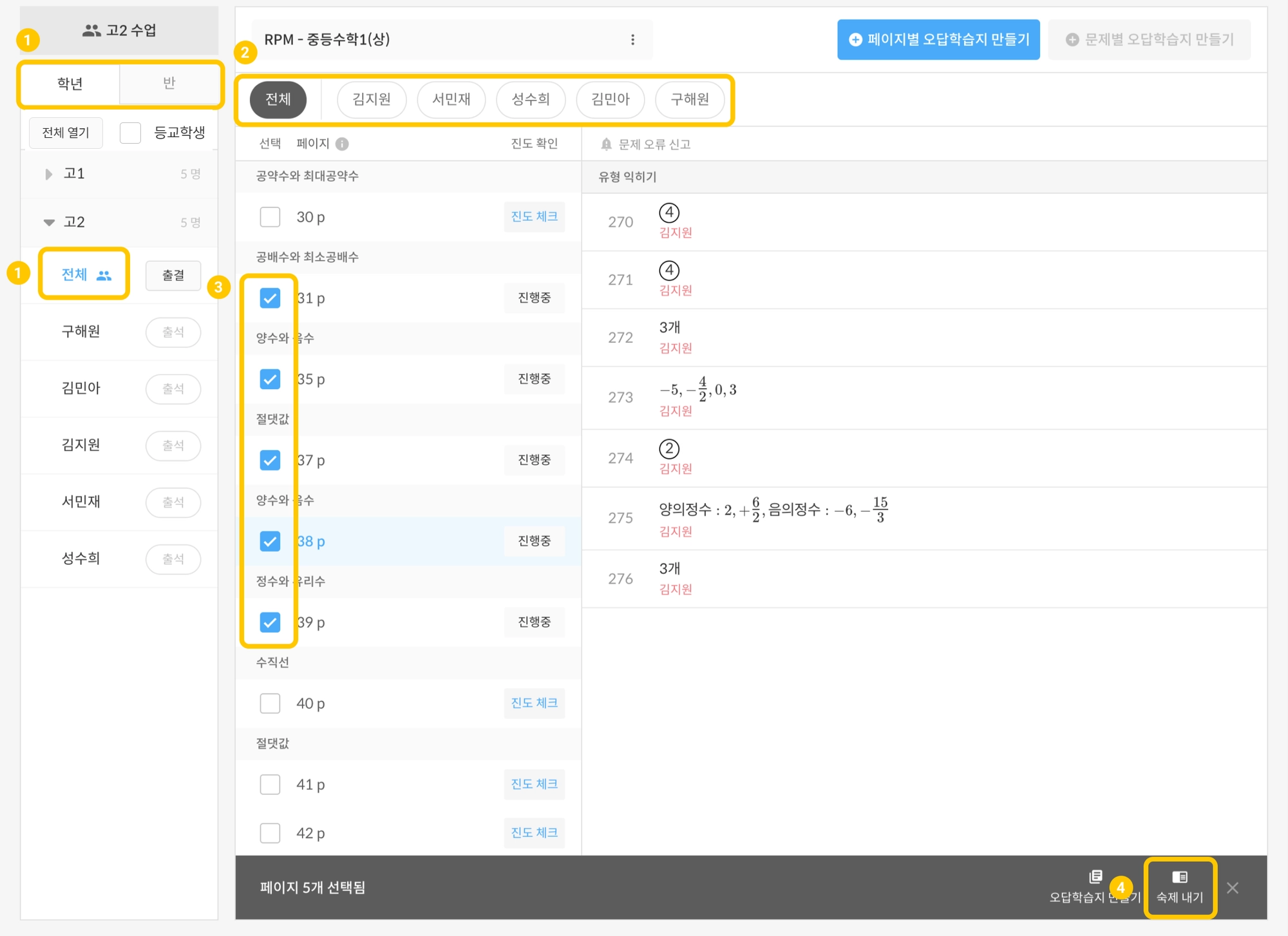 학년 또는 반에게 교재 숙제내기