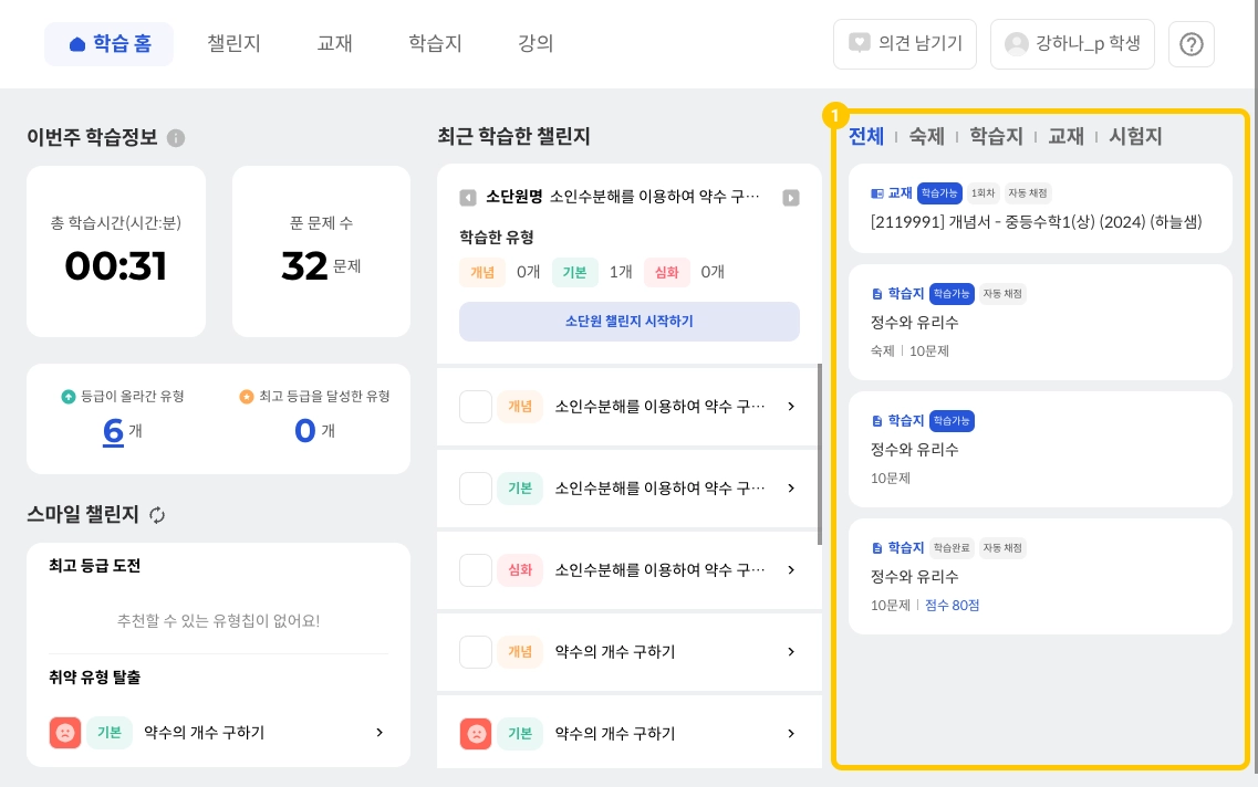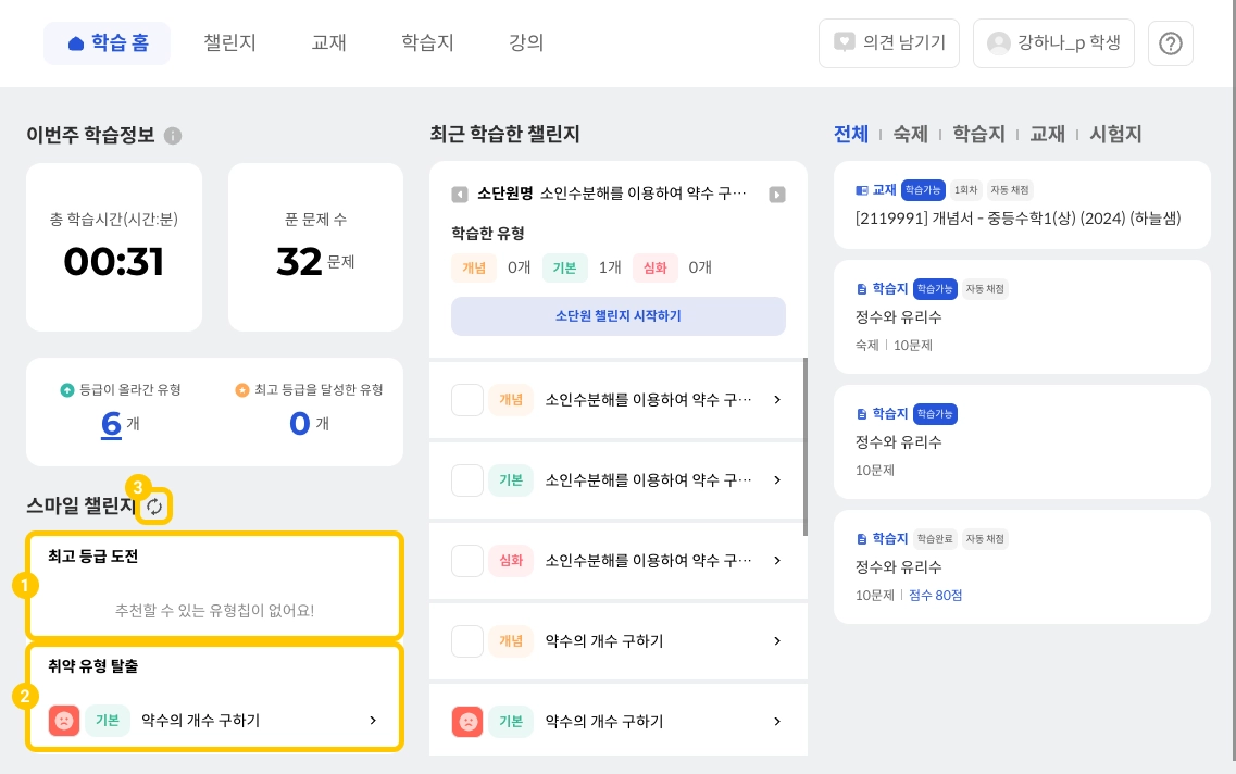 최근 학습한 챌린지에서는 챌린지 탭에서 최근 챌린지 학습한 소단원이 추천됩니다.