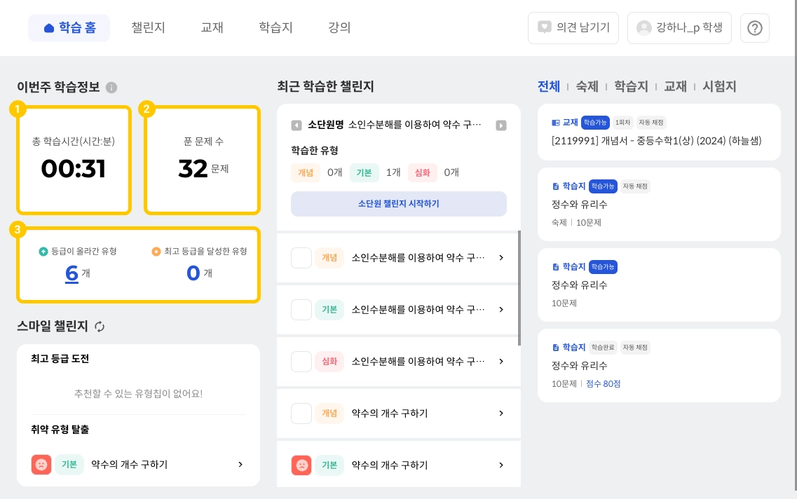 시험지를 제외한 챌린지, 교재, 학습지, 강의 등을 통해 학습을 하면 학습 시간이 누적됩니다.