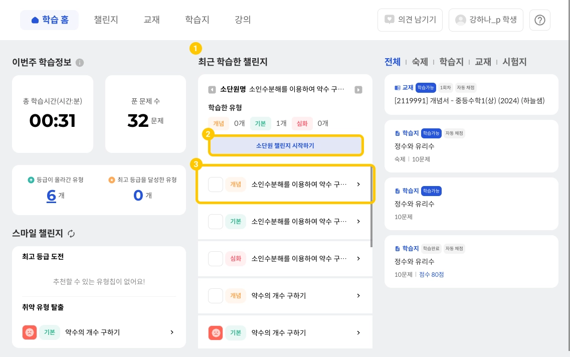 소단원 챌린지를 시작하기를 눌러 소단원 챌린지를 시작 할 수 있습니다.