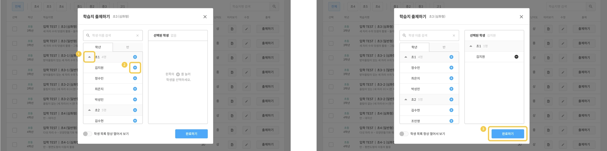 목록의 + 버튼을 누르면 학생이 오른쪽 열에 추가됩니다.