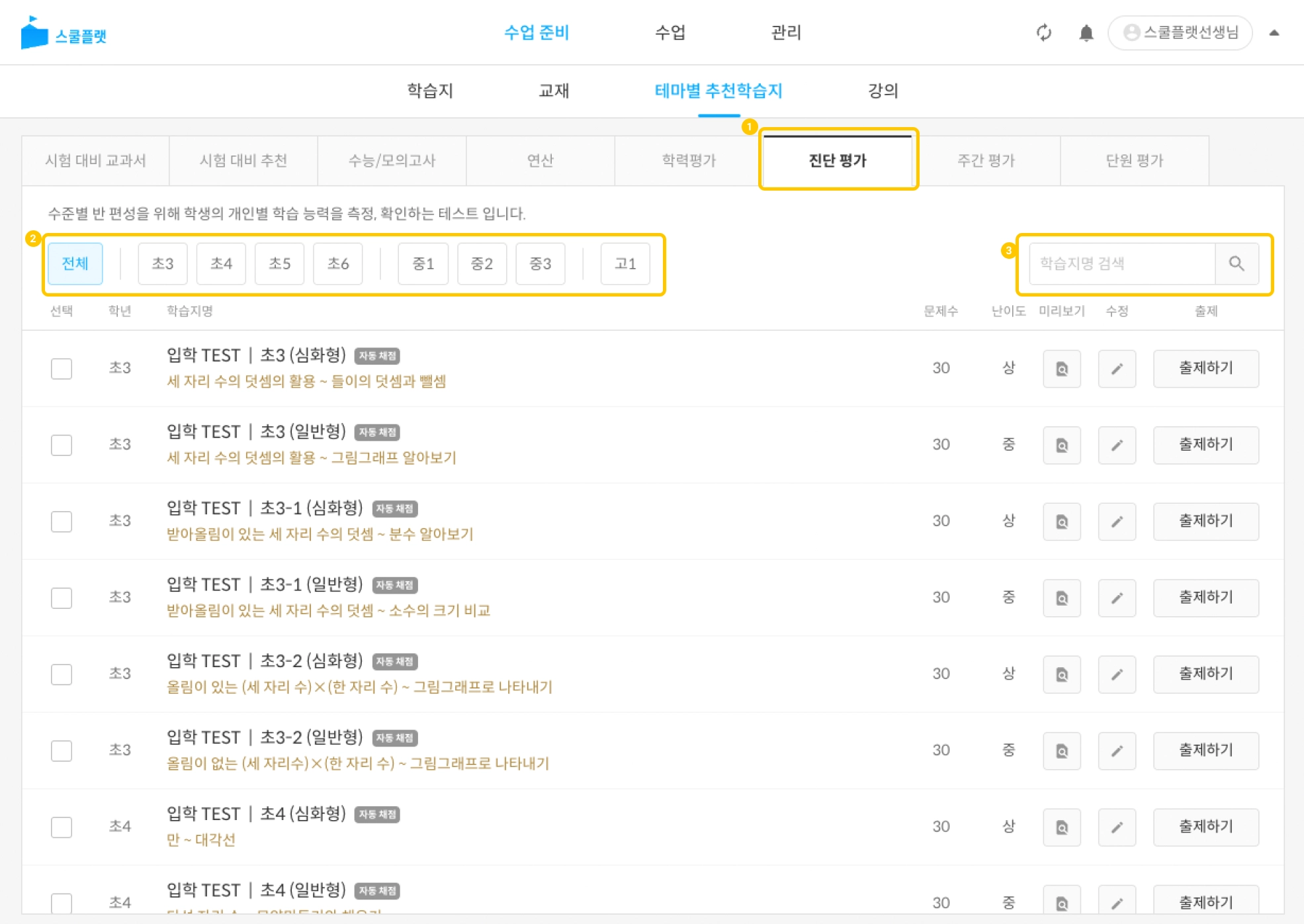 [수업 준비] - [테마별 추천학습지] - [진단 평가]에서 학습지 목록을 확인할 수 있습니다.