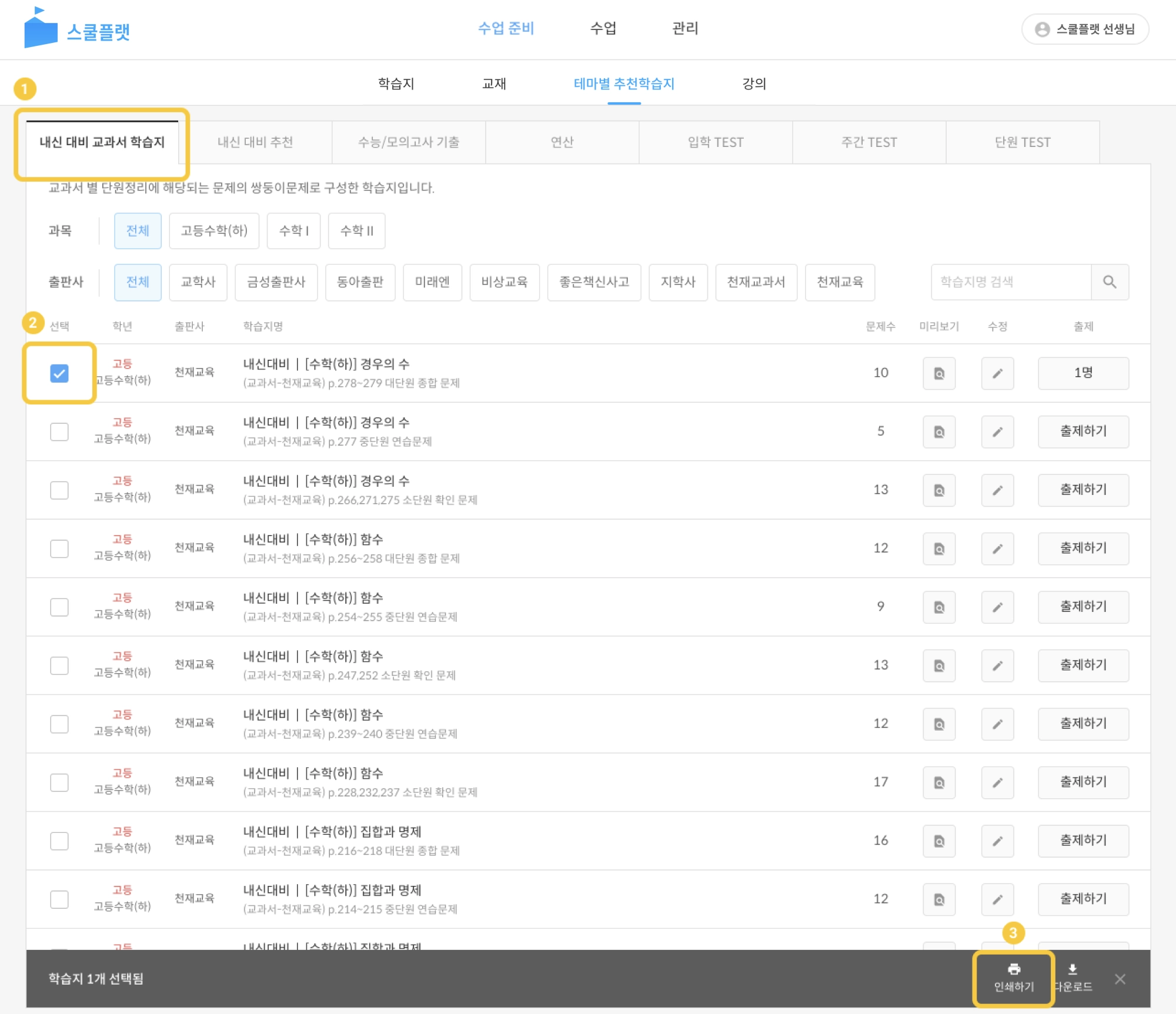 학습지 목록 중 인쇄할 학습지를 선택합니다.