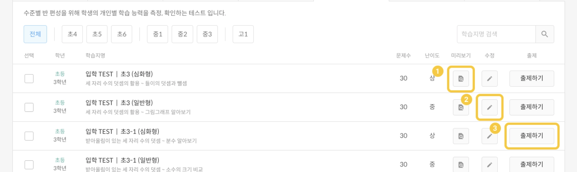 학습지명을 검색해 원하는 진단 평가 학습지를 찾을 수 있습니다.