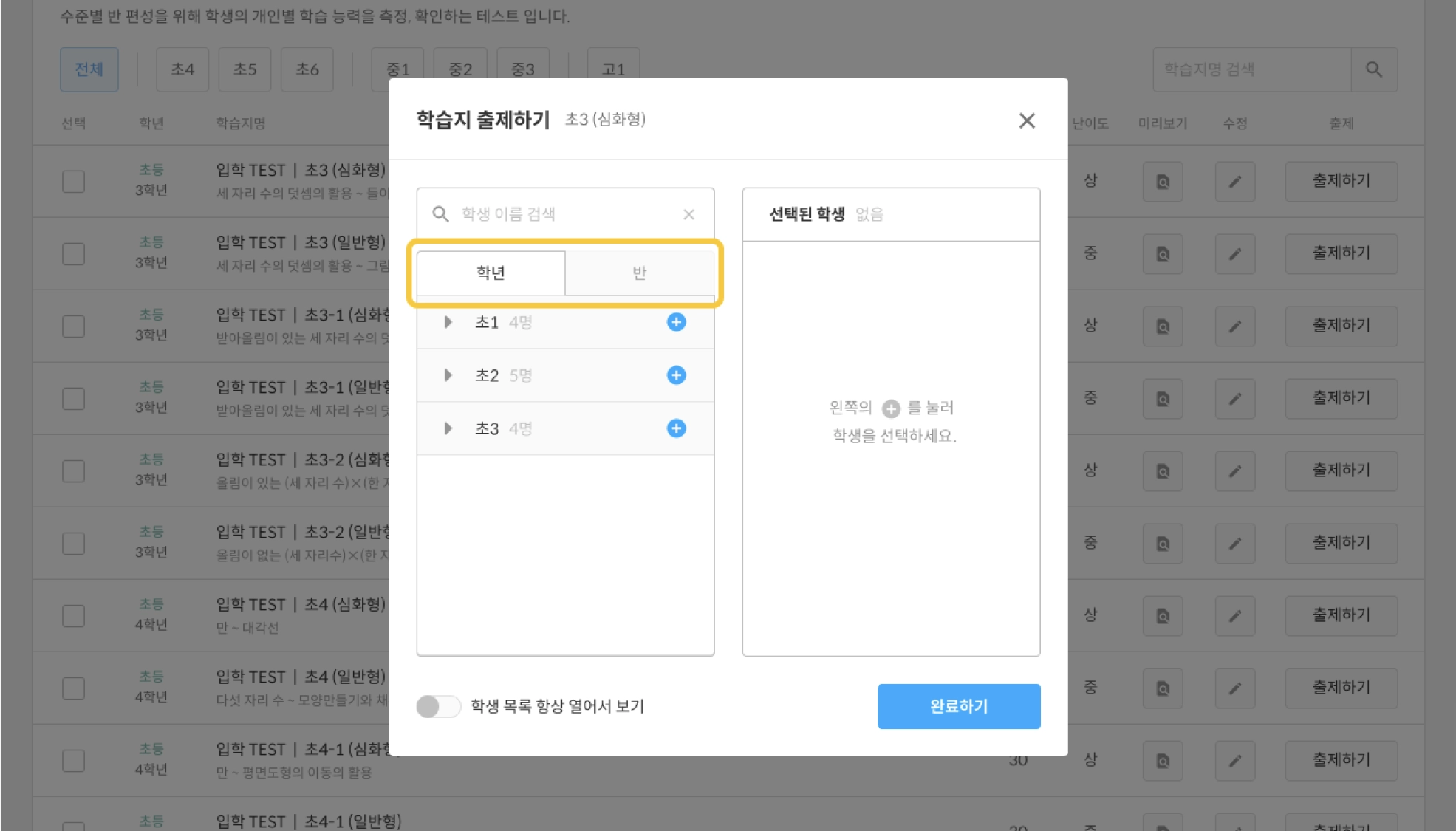학년탭을 선택하면 학년별로 원하는 학생에게 출제가 가능합니다.