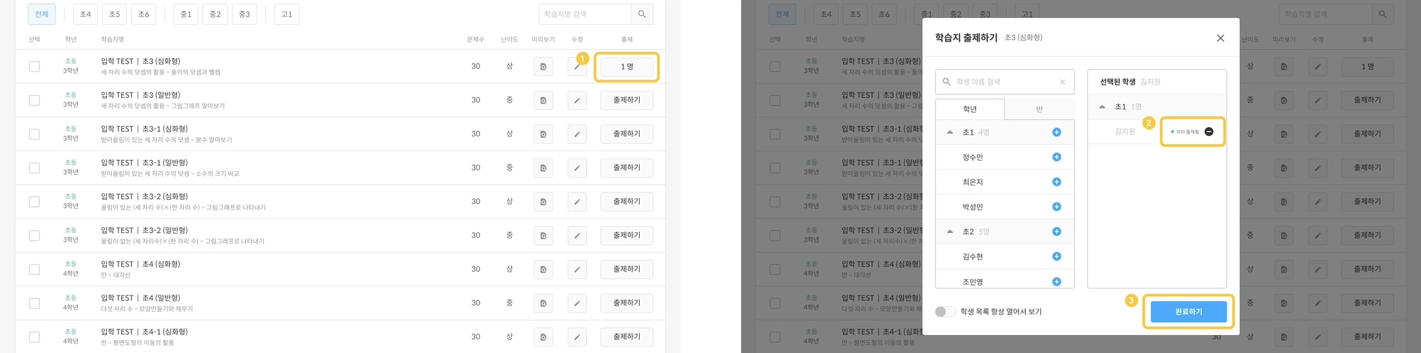 출제된 진단 평가 학습지의 1명(출제한 학생수) 버튼을 누르면 출제하기 팝업이 뜹니다.
