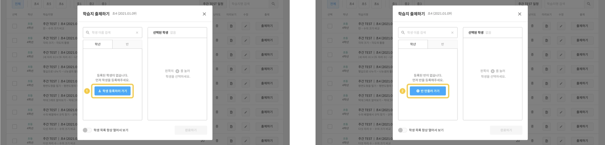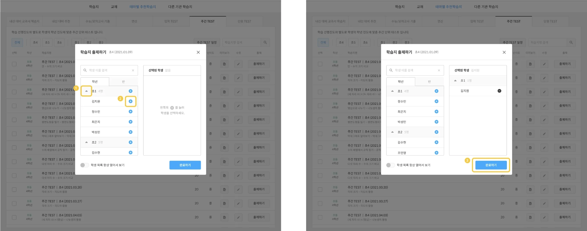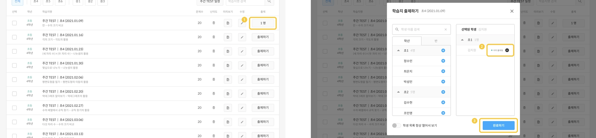 출제된 주간 평가 학습지의 1명(출제한 학생수) 버튼을 누르면 출제하기 팝업이 뜹니다.