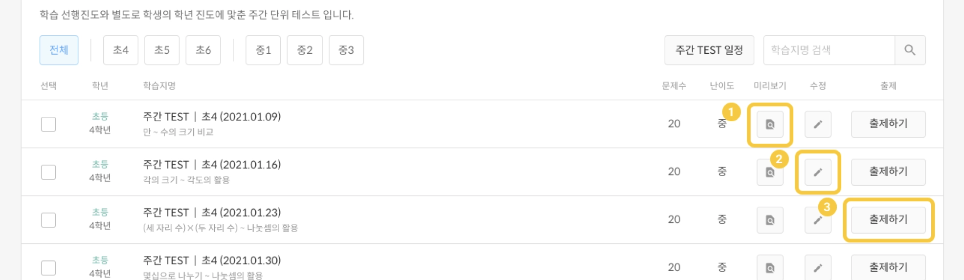전체 초4 초5 초6 중1 중2 중3 필터를 통해 학년별 주간 평가 학습지를 볼 수 있습니다.