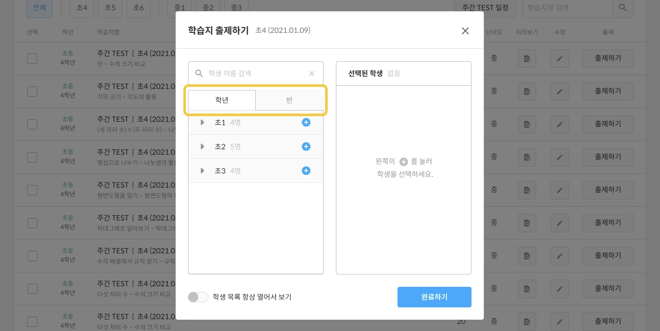 학년탭을 선택하면 학년별로 원하는 학생에게 출제가 가능합니다.