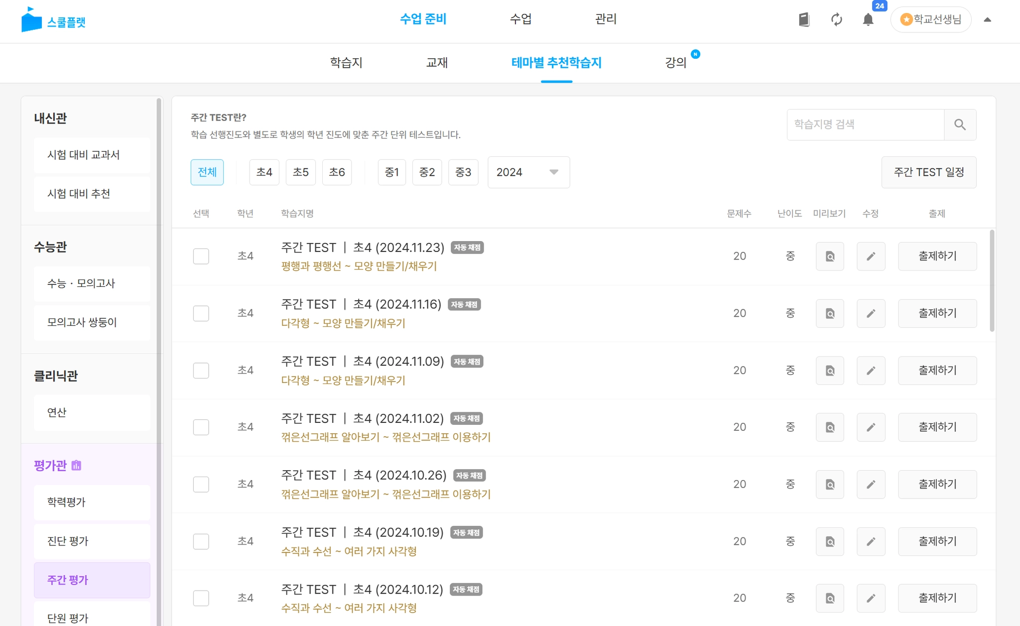 [수업 준비] - [테마별 추천학습지] - [주간 평가]에서 학습지 목록을 확인할 수 있습니다.