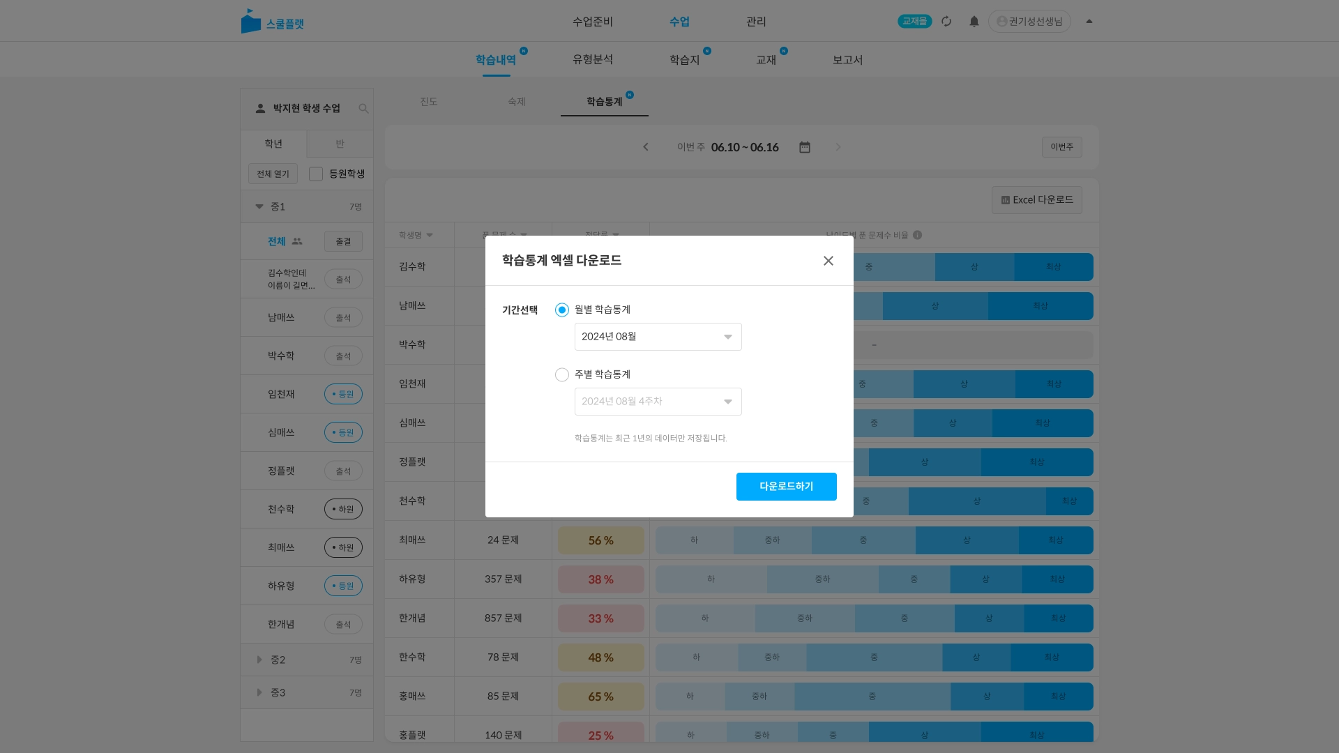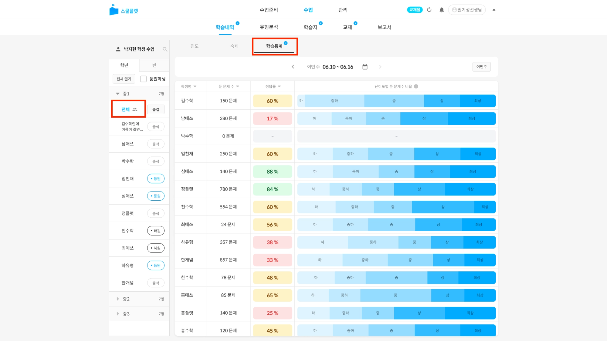 학생 목록에서 ‘전체’ 선택하시면 ‘학습 통계’를 확인하실 수 있어요.