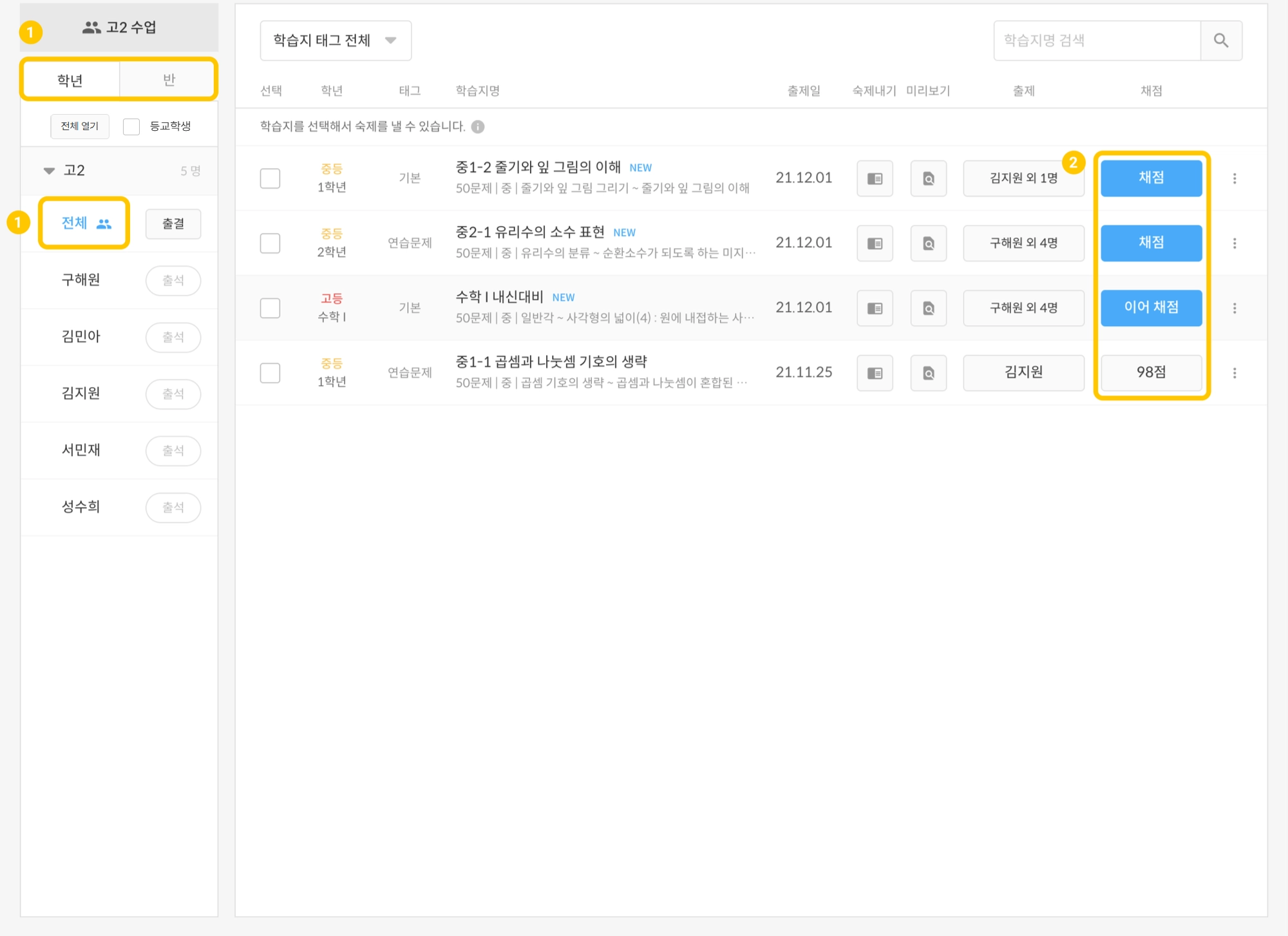 학년 및 반 학습지 채점하기