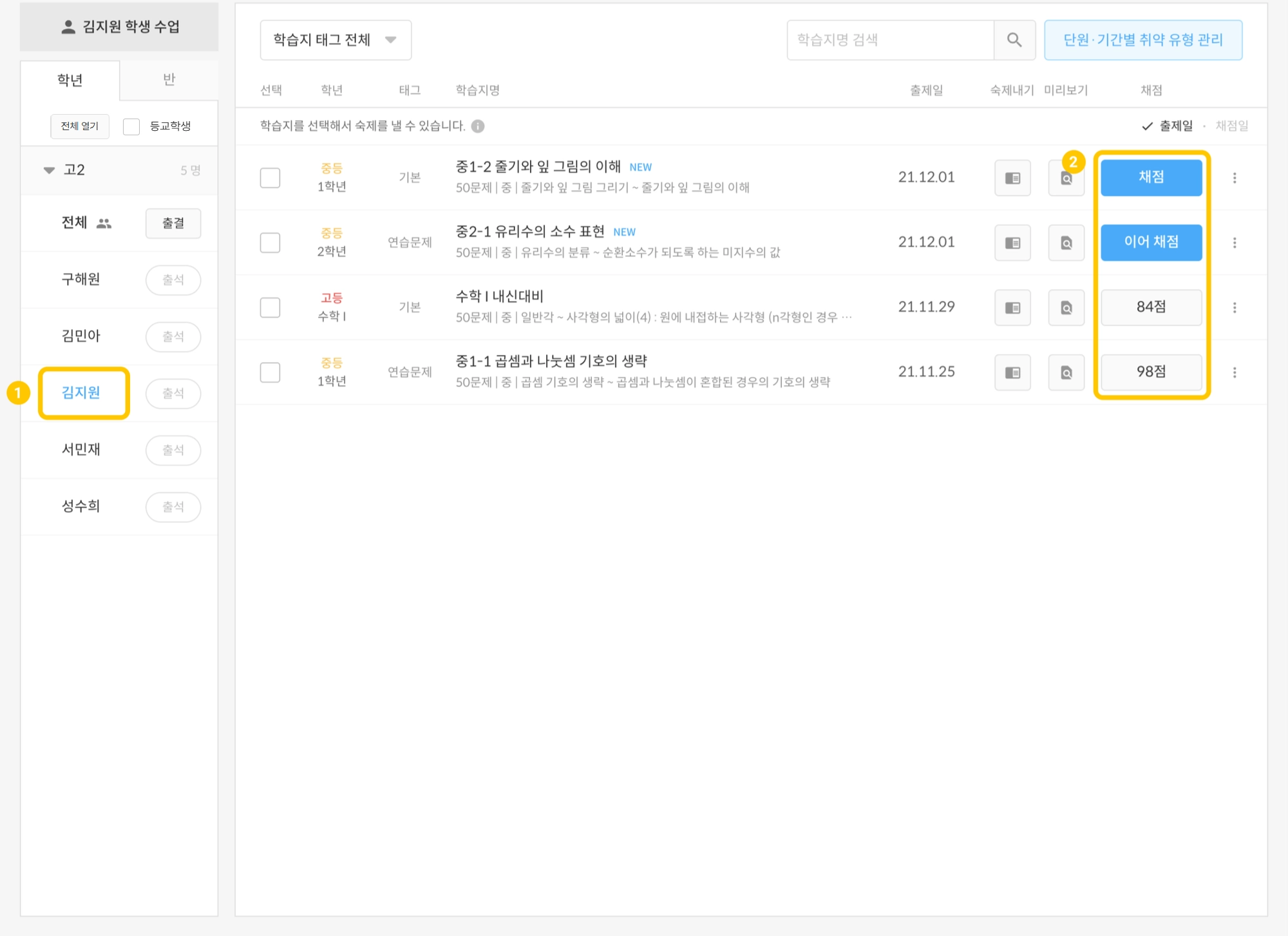 채점하고 싶은 학습지의 채점 버튼을 누릅니다.