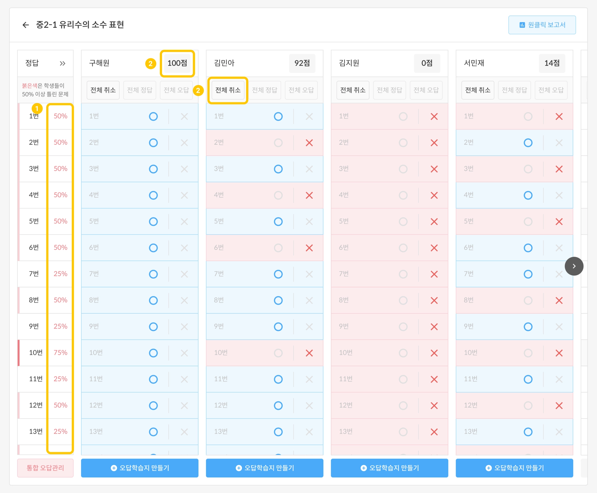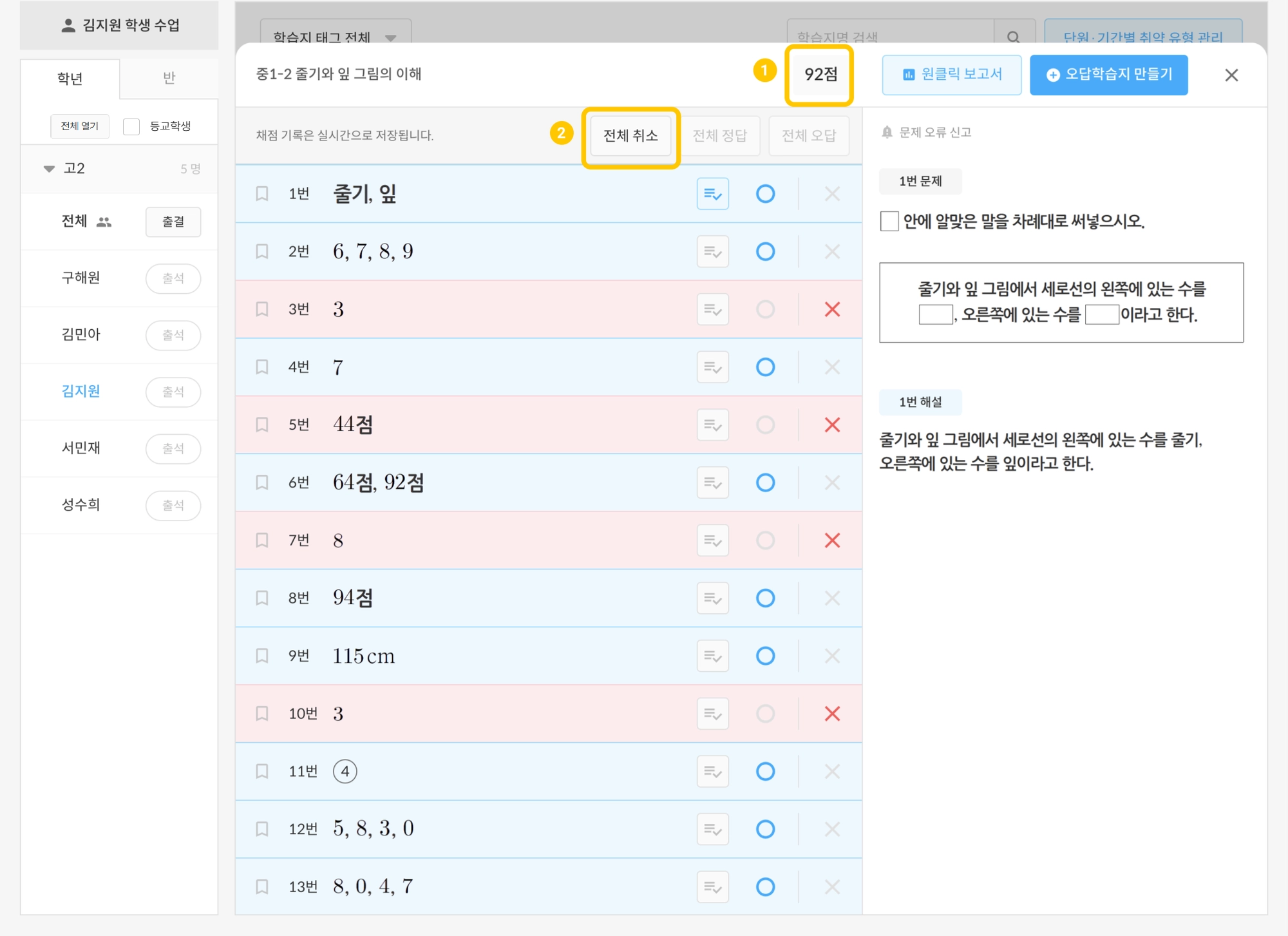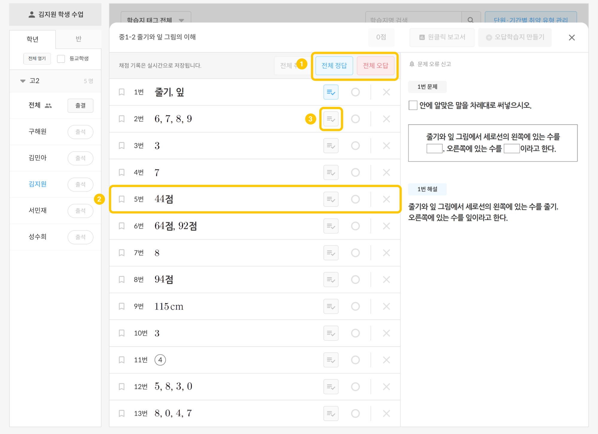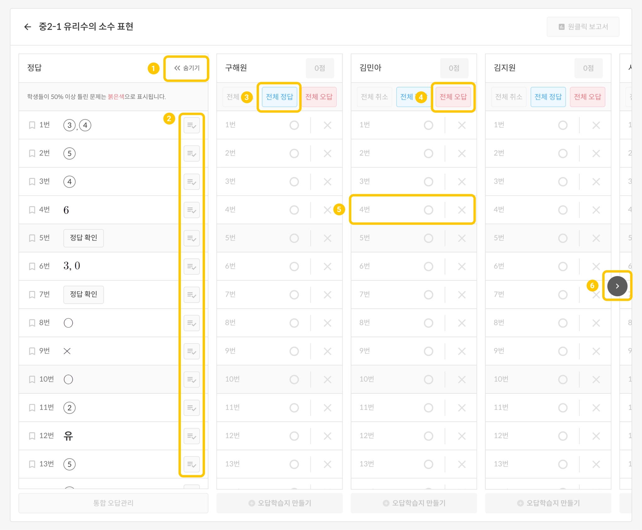 많이 틀린 학생들은 전체 오답을 누른 후 맞은 문제만 체크하여 빠르게 채점할 수 있습니다.