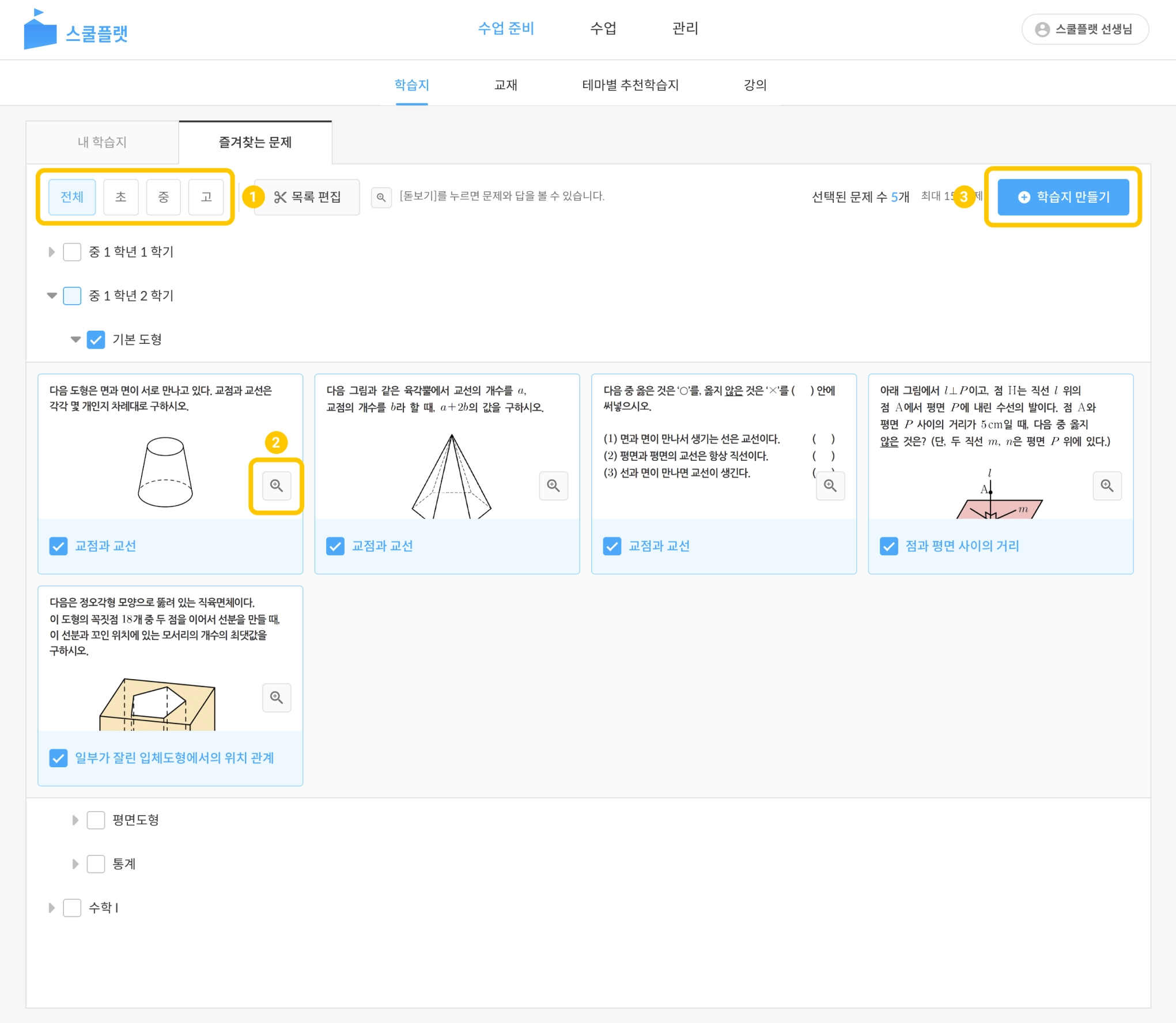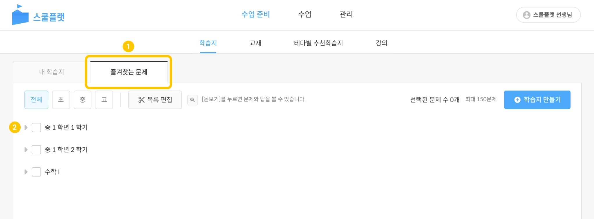 [수업 준비] - [학습지]에 들어간 후, [즐겨찾는 문제] 탭에 들어갑니다.