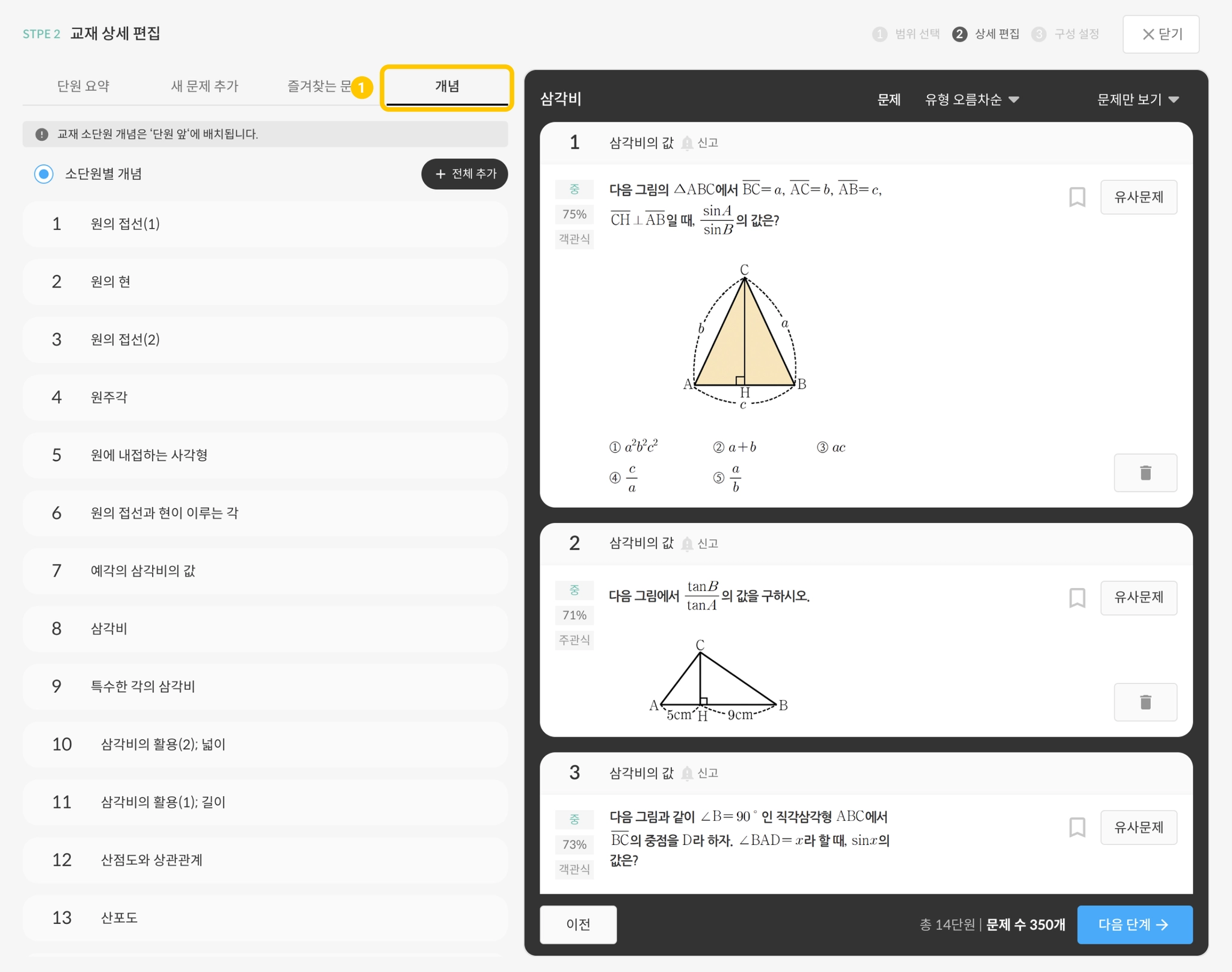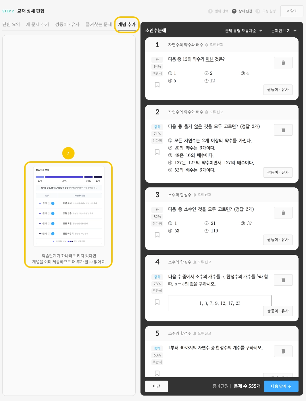 ‘단계별 내교재’에서는 이미 ‘개념’이 추가되어 있으므로, ‘개념 추가’를 별도로 하지 않으셔도 됩니다.