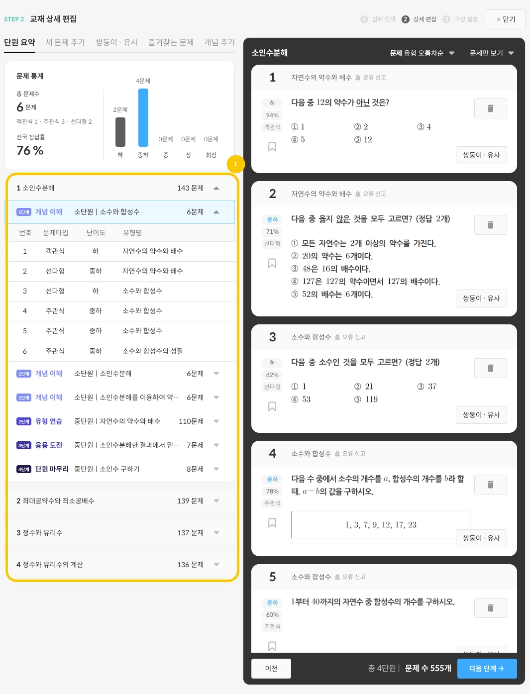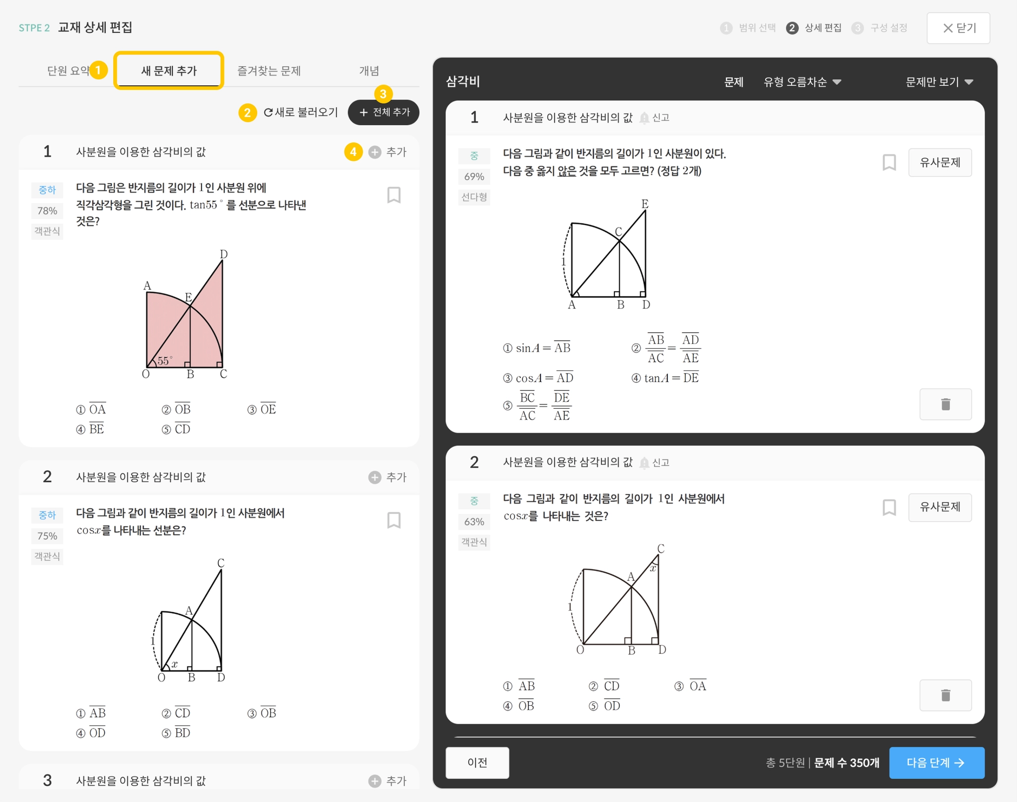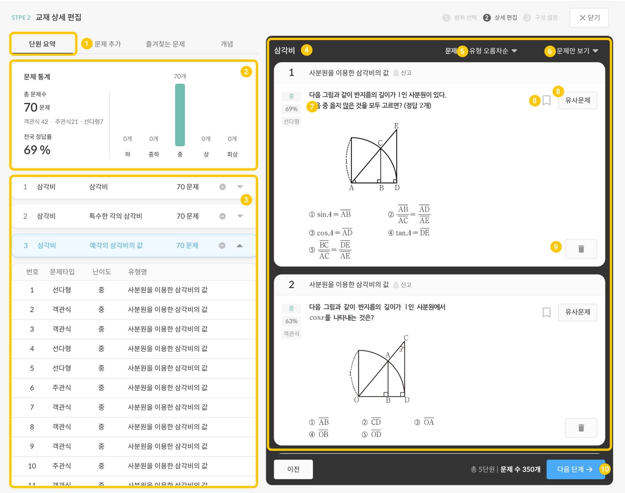 STEP.01에서 구성한 단원과 학습단계가 어떤 문제들로 구성되었는지 확인합니다.
