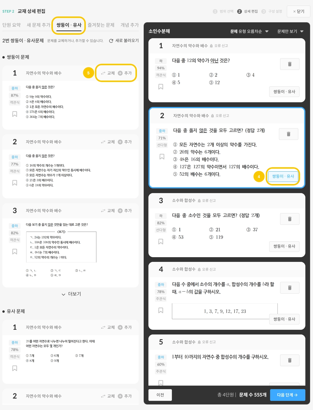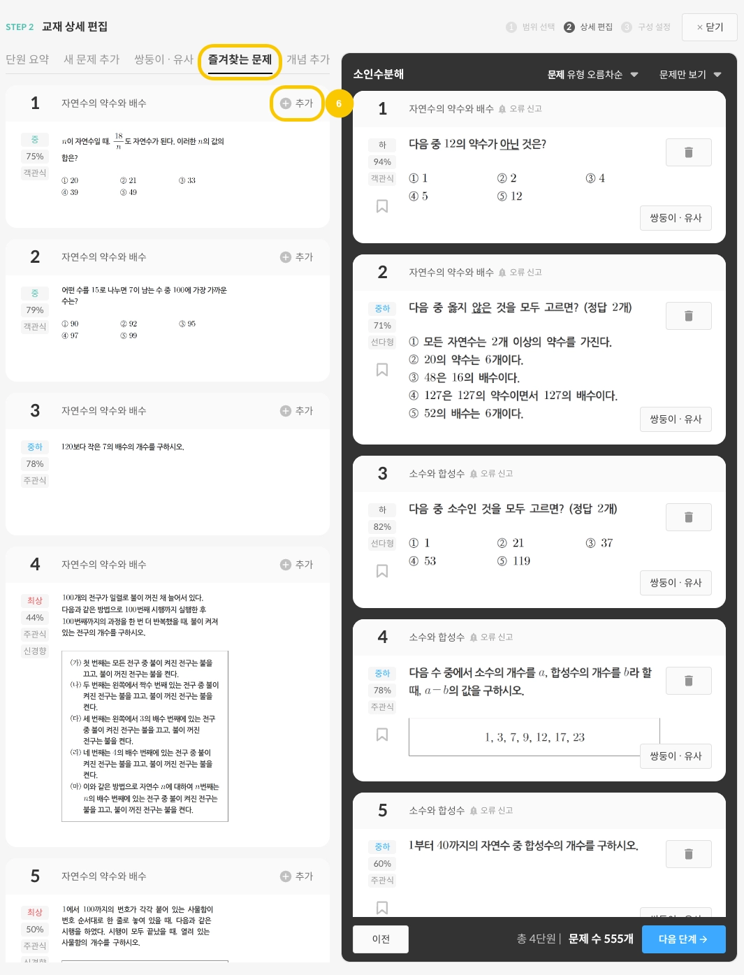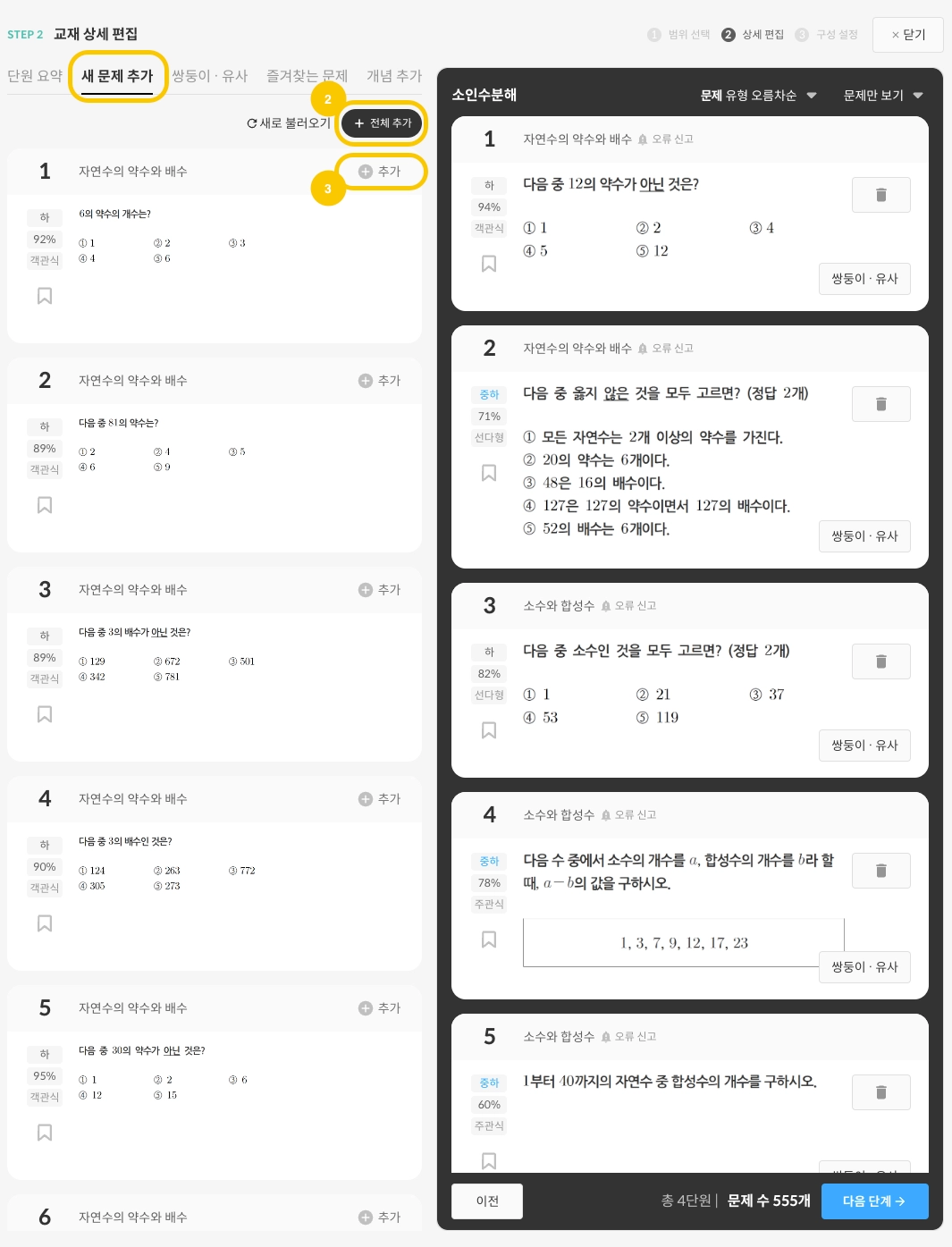 STEP.01에서 구성한 단원과 학습단계가 어떤 문제들로 구성되었는지 확인합니다.