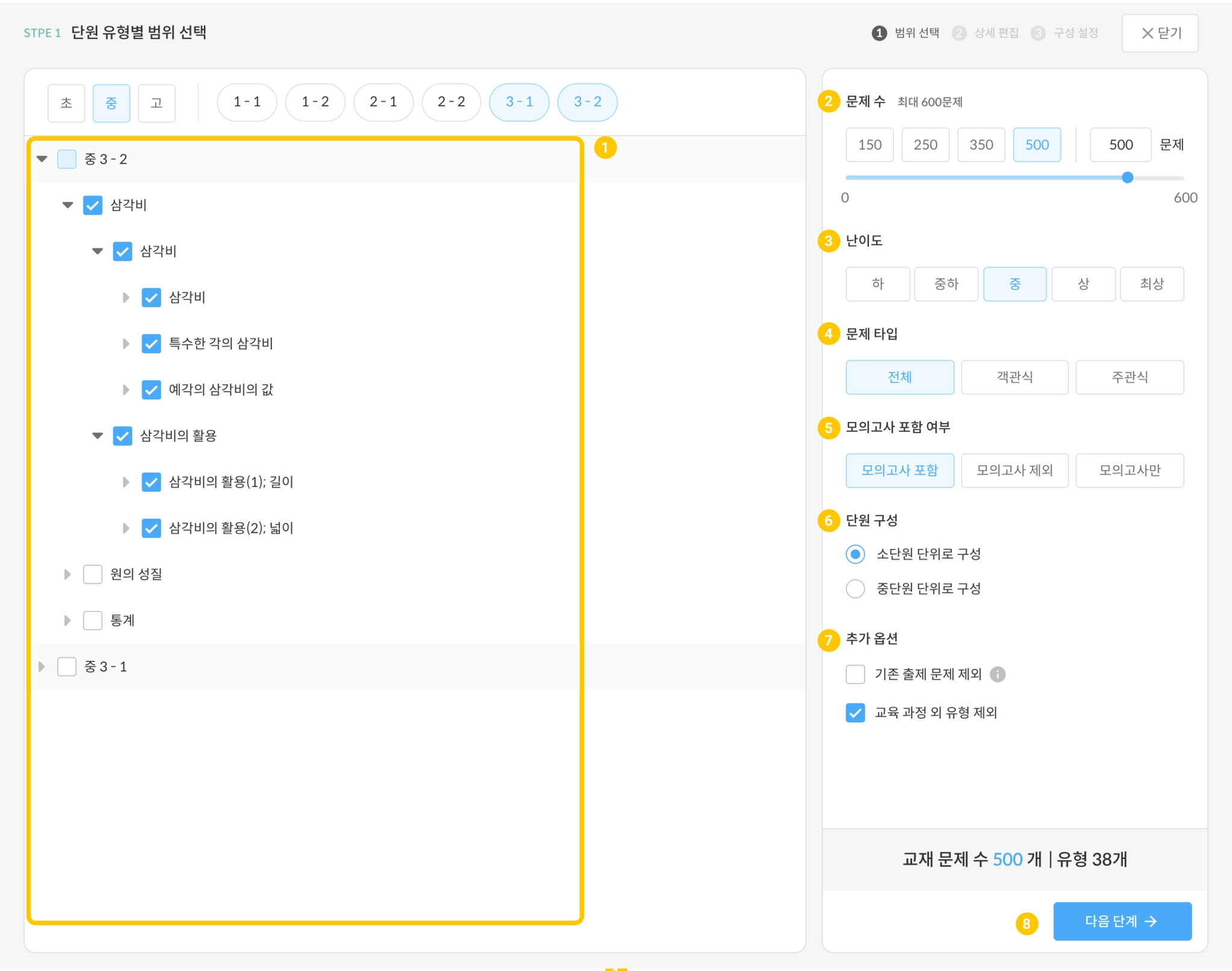 교육 과정 외 유형 제외: 교육 과정에서 벗어난 문제를 제외하는 옵션입니다.