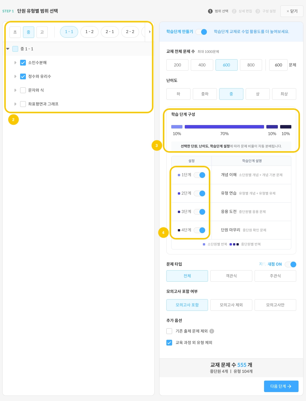 선택한 교재 난이도와 학습단계에 따라 단계별 문제수가 자동 배분됩니다.