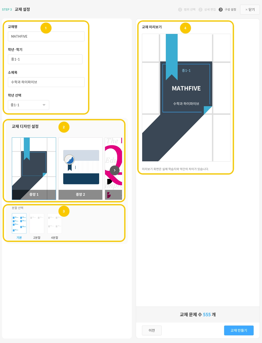 만들고 싶은 교재의 범위와 주요 옵션값을 선택합니다.