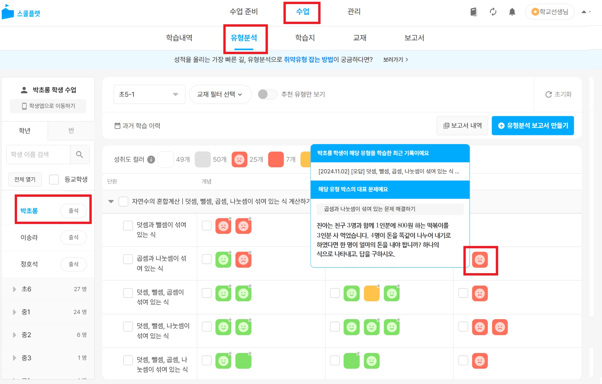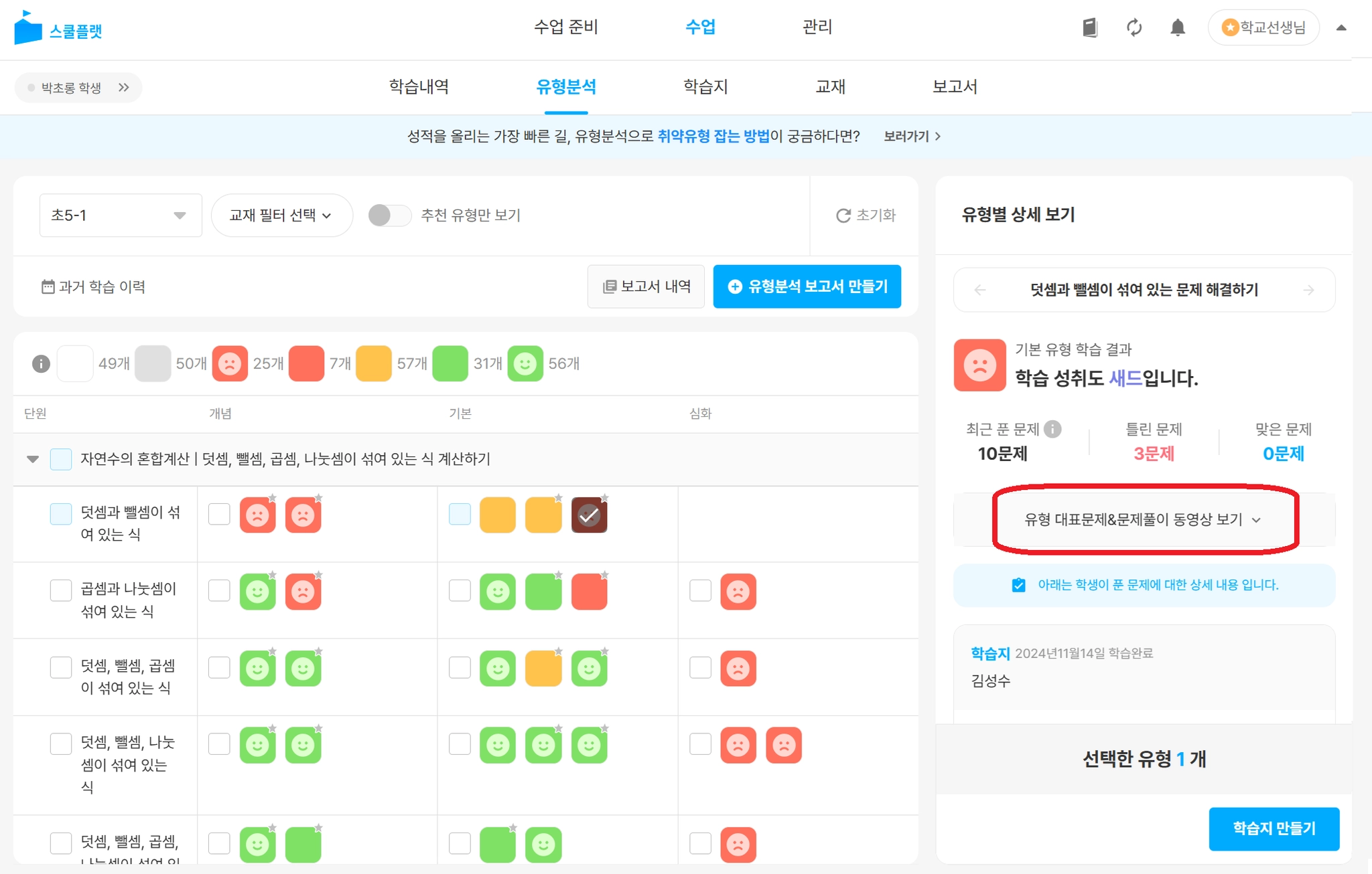 탭에서 특정 학생을 선택하고, 유형을 누르면 유형별 상세 보기가 가능합니다.