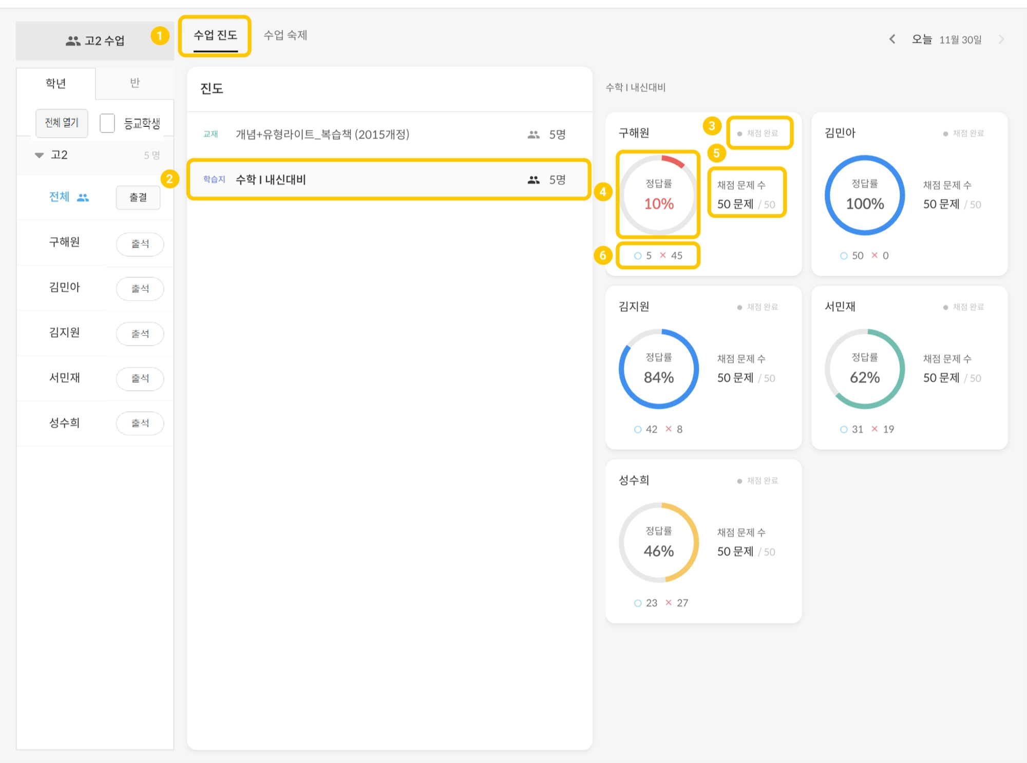 한 학년이나 반의 학습 현황을 한눈에 볼 수 있습니다. 그룹에 속한 학생들이 학습지나 교재를 얼마나 풀었고 맞았는지를 확인할 수 있고, 숙제 완료 체크도 할 수 있습니다.