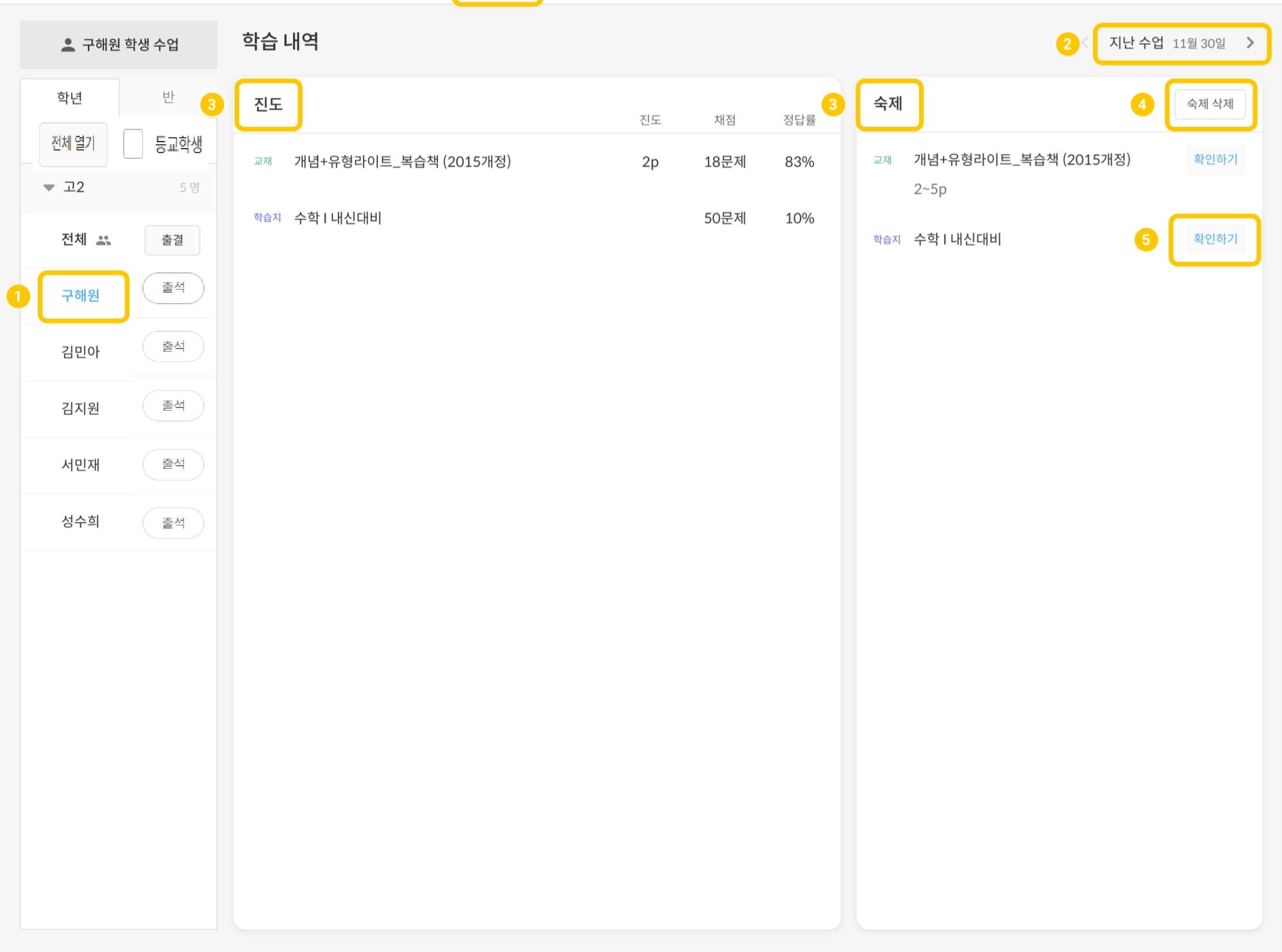 수업 탭에 들어가 학습 내역을 확인하고 싶은 학생 이름을 누릅니다.