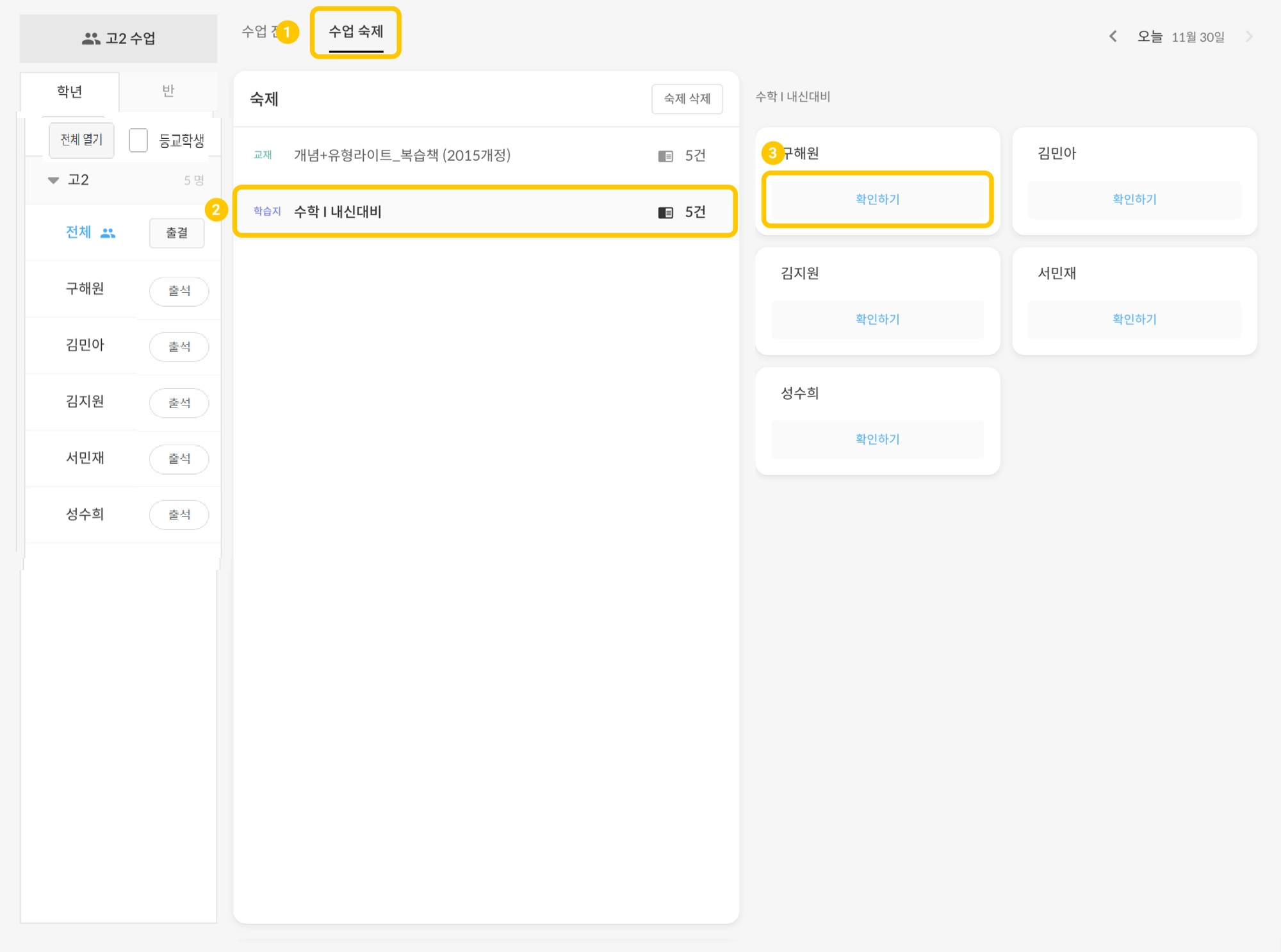 숙제를 다 한 학생의 확인하기 버튼을 눌러 숙제 완료를 체크할 수 있습니다.