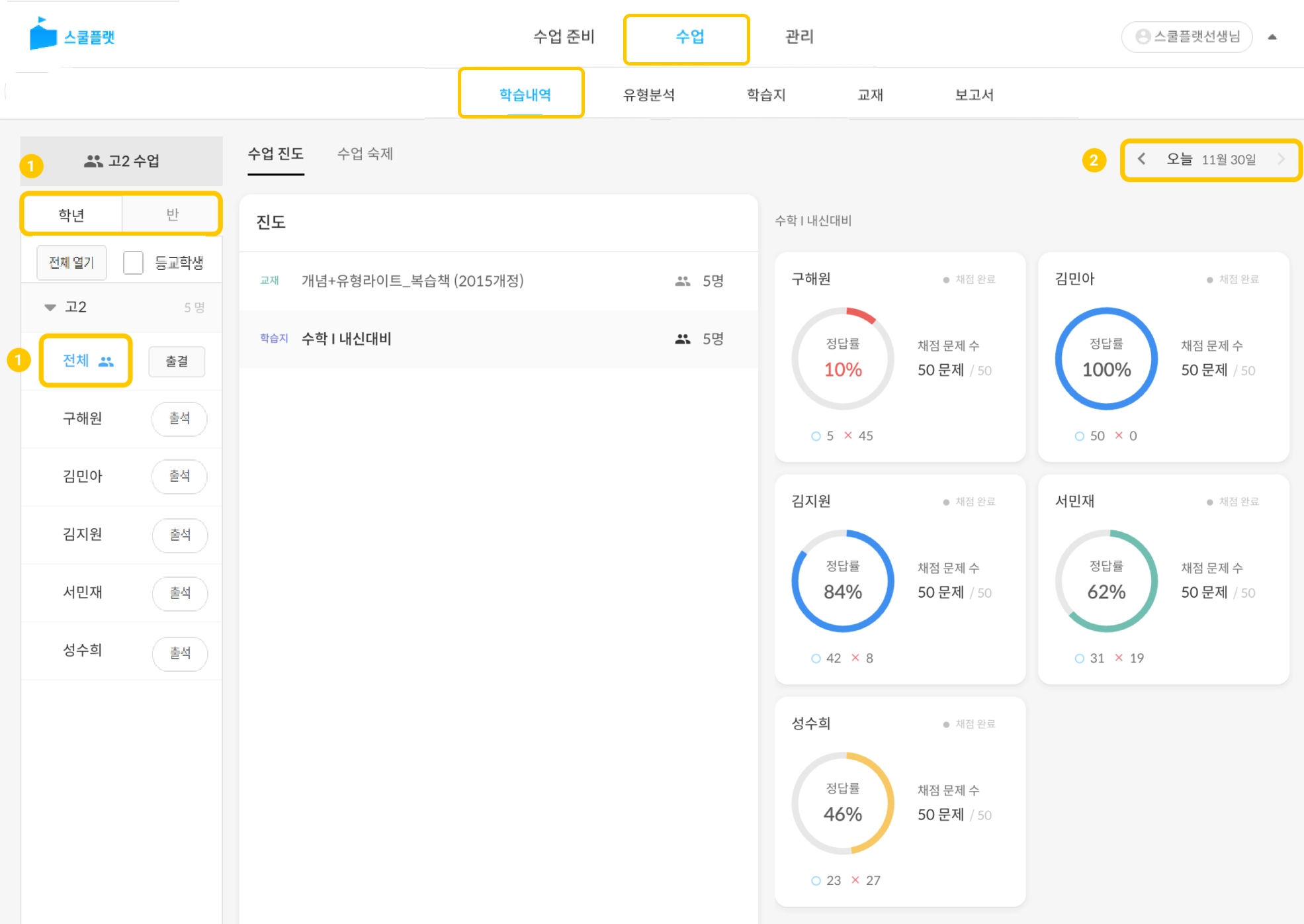 수업 > 그룹(학년 또는 반) 또는 학생 선택 > 학습 내역