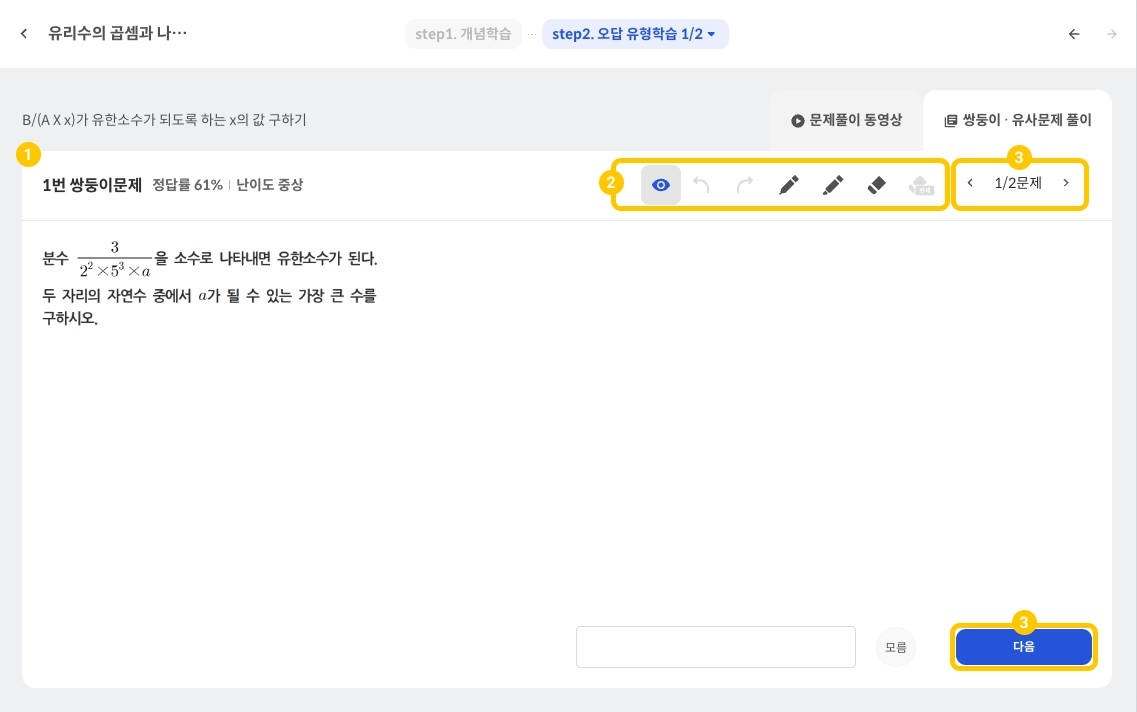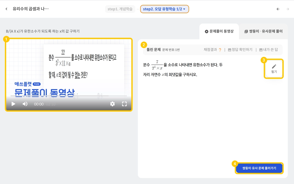 오답 보충 학습은 오답 문제와 관련된 풀이 동영상을 보고 쌍둥이∙유사 문제(총2 문제)를 모두 학습하여 맞으면 완료됩니다.