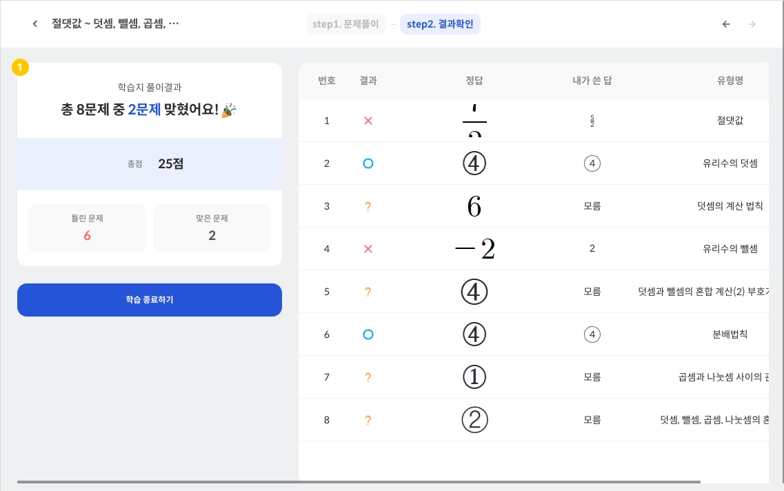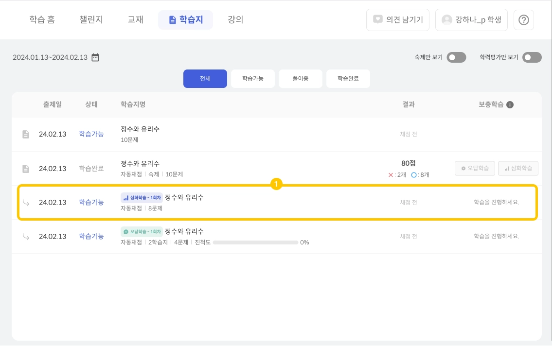 학습지탭에서 출제된 학습지를 풀고 채점이 완료합니다.