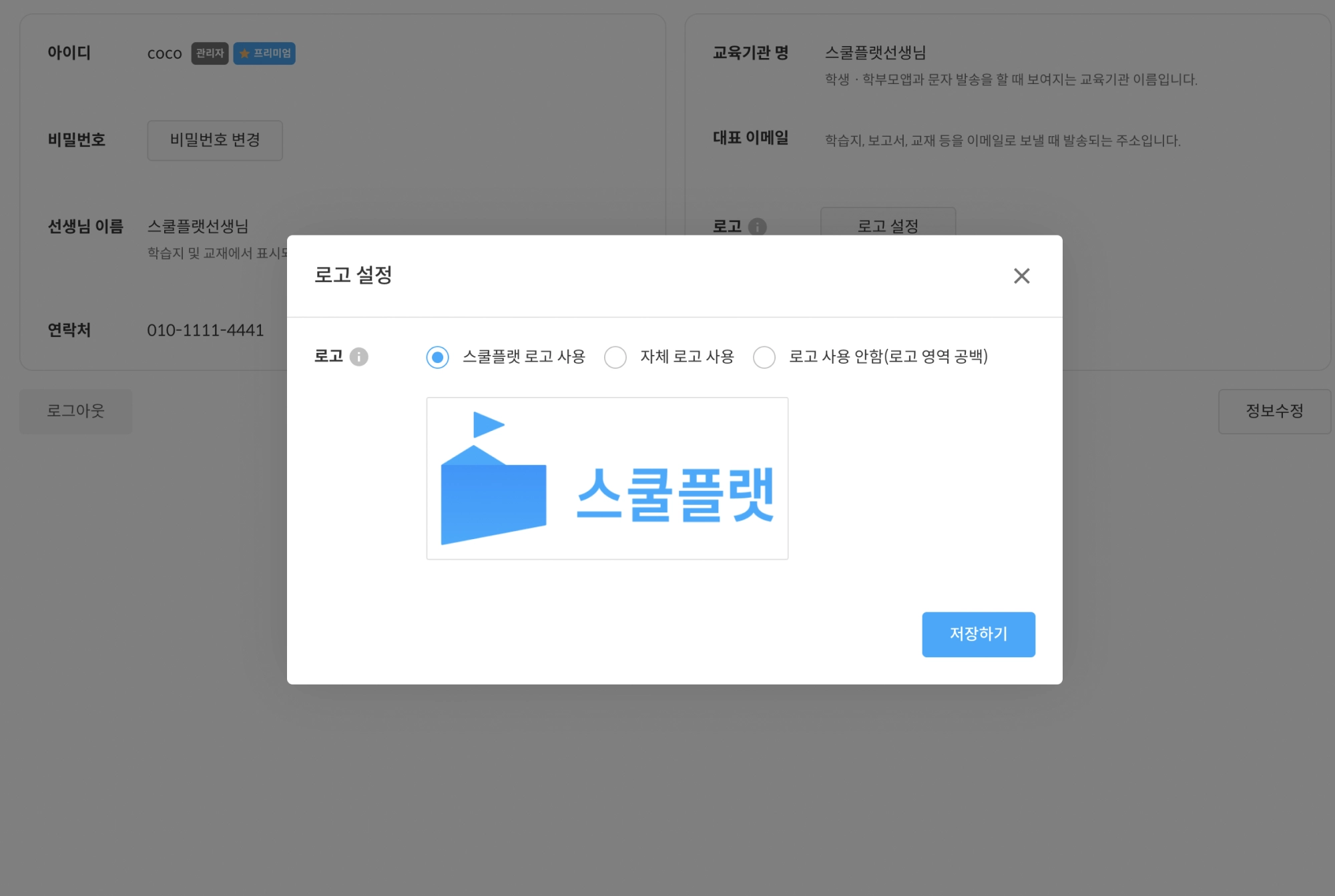 학원 로고를 설정 및 변경하고 싶은 경우 로고 설정 버튼을 눌러주세요.