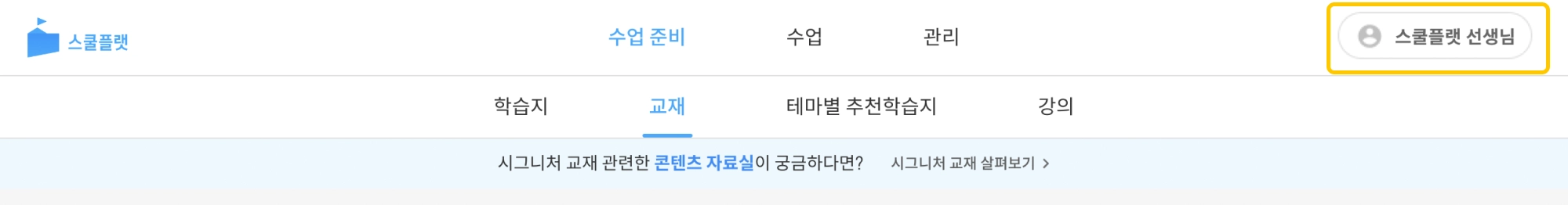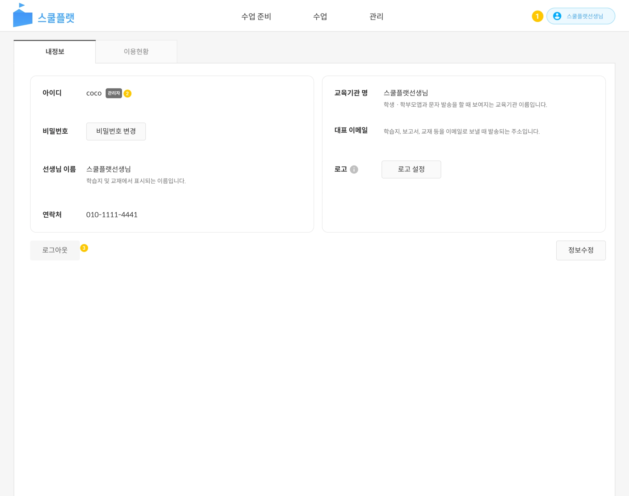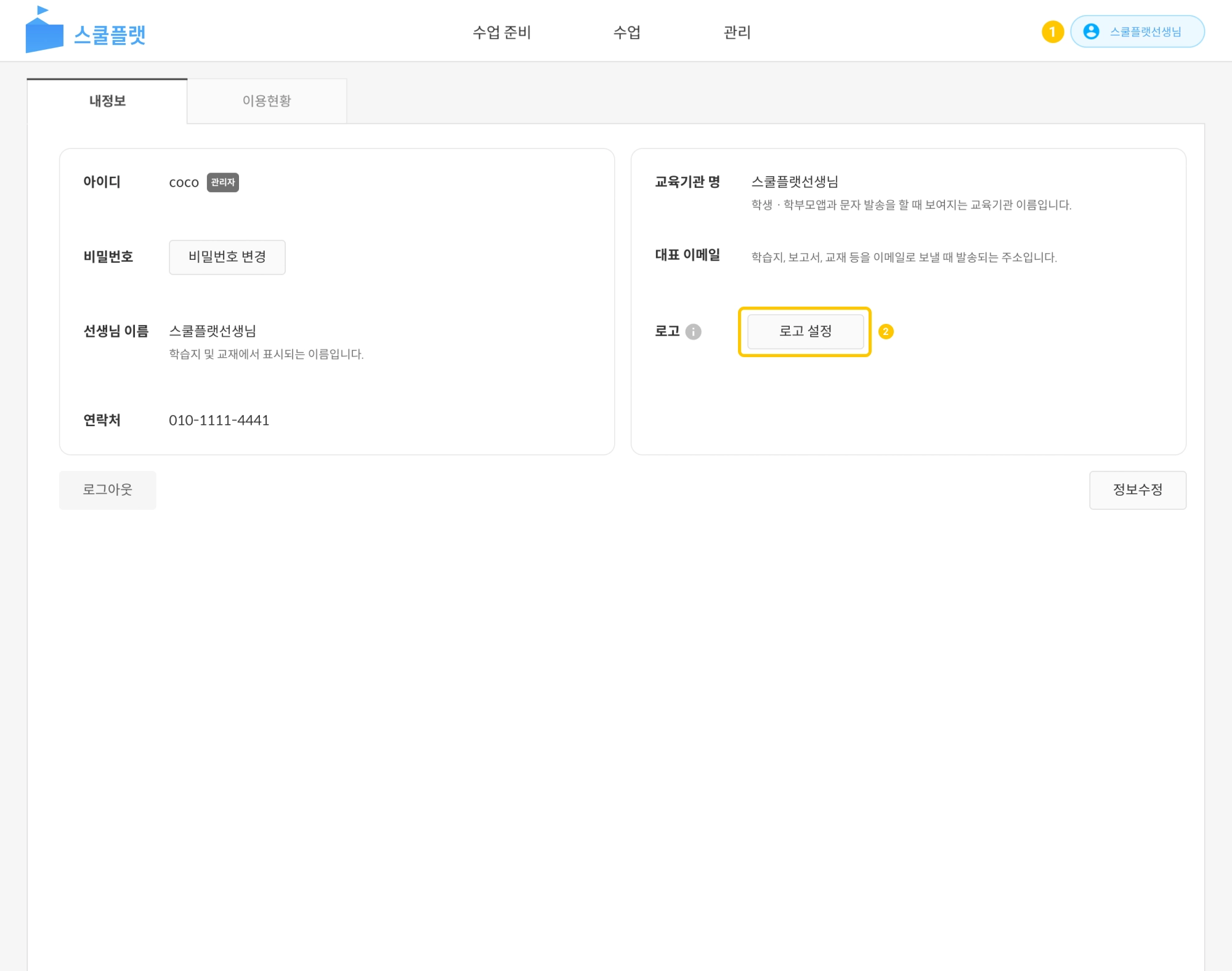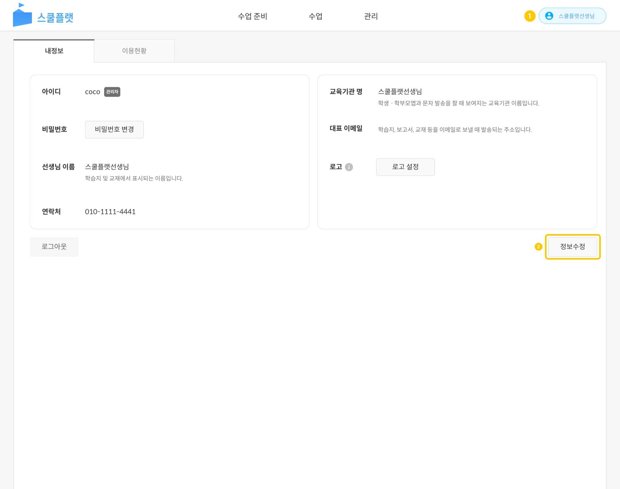 스쿨플랫 사이트 우측 최상단 선생님 이름을 누르면 내 정보 화면으로 이동합니다.