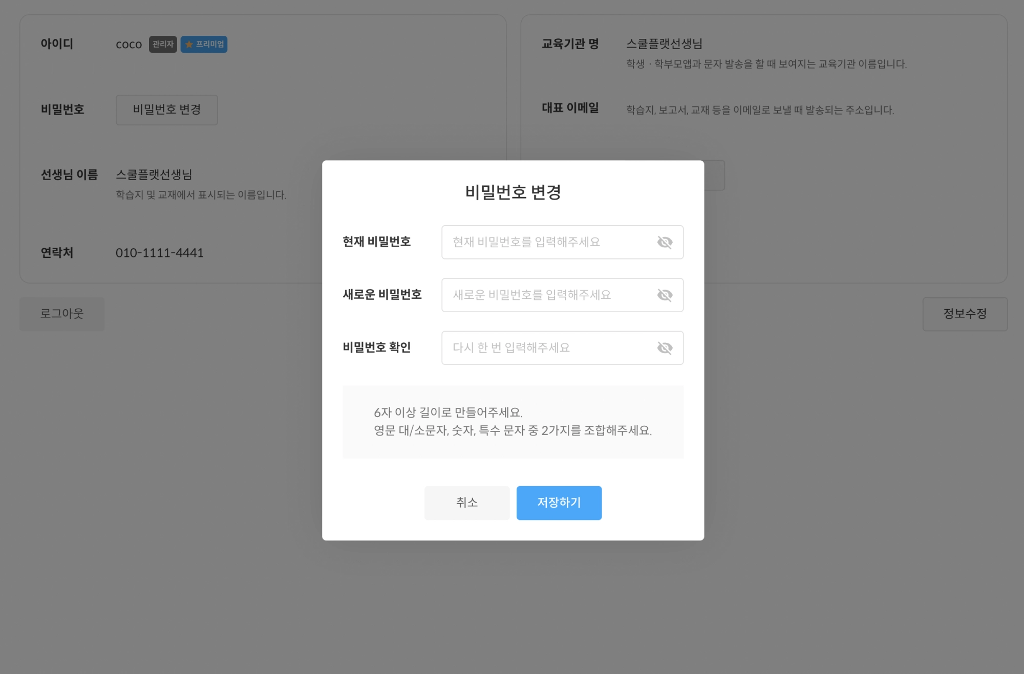 비밀번호 변경 후 저장하기를 눌러주세요.