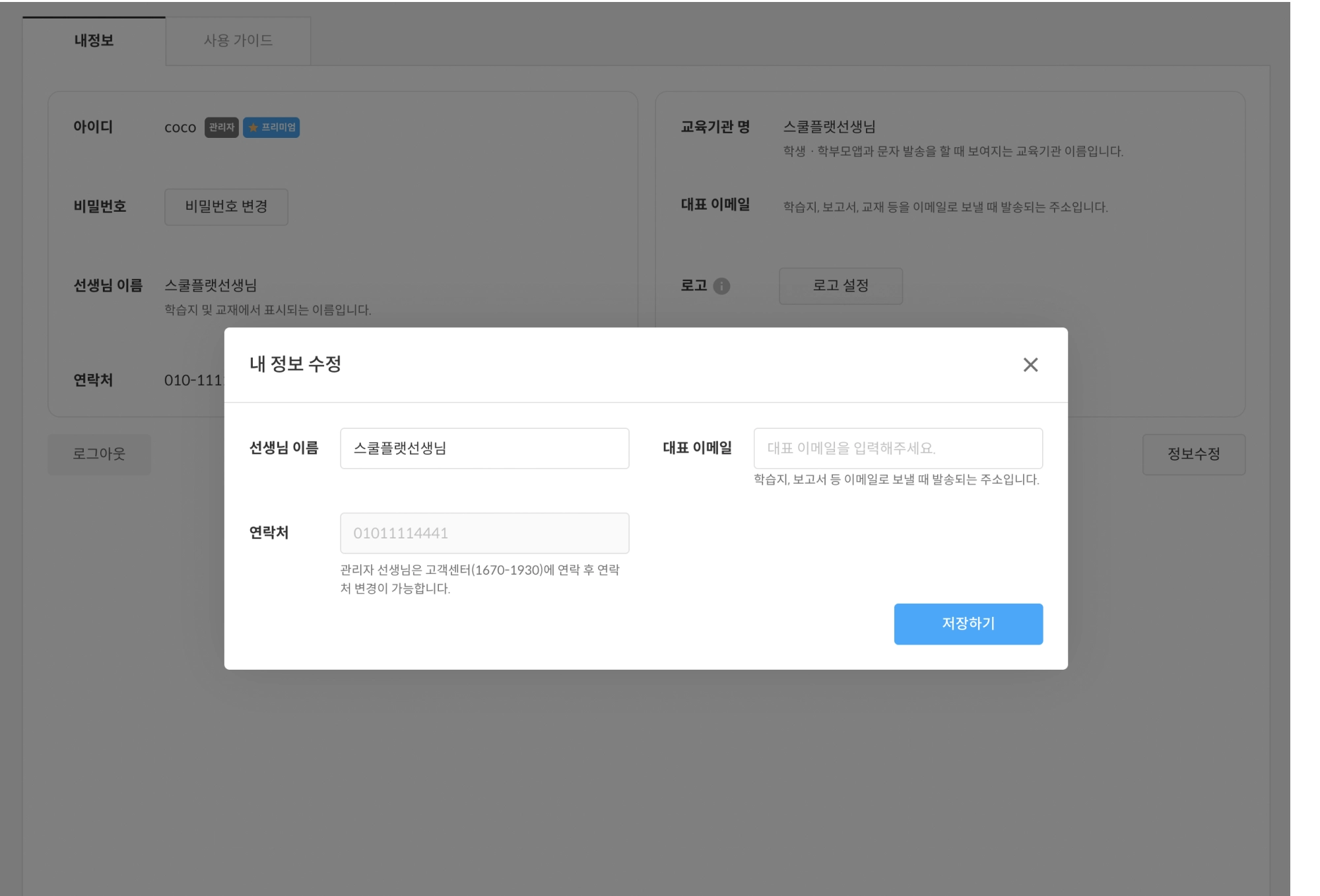 선생님 이름을 눌렀을 때 나오는 내 정보 화면입니다.