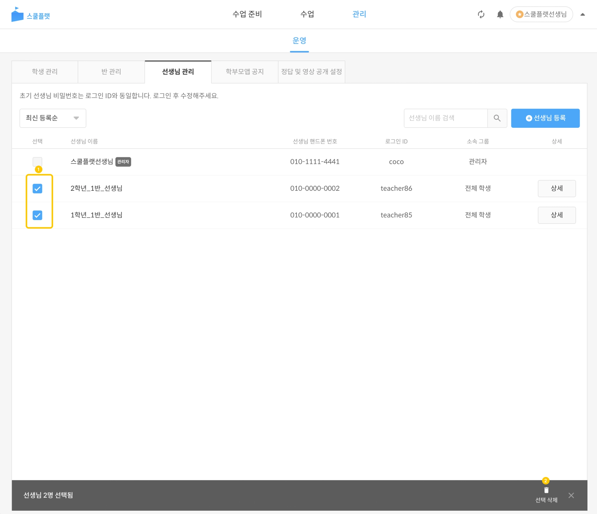선생님을 일괄 선택하여 삭제가 가능합니다.