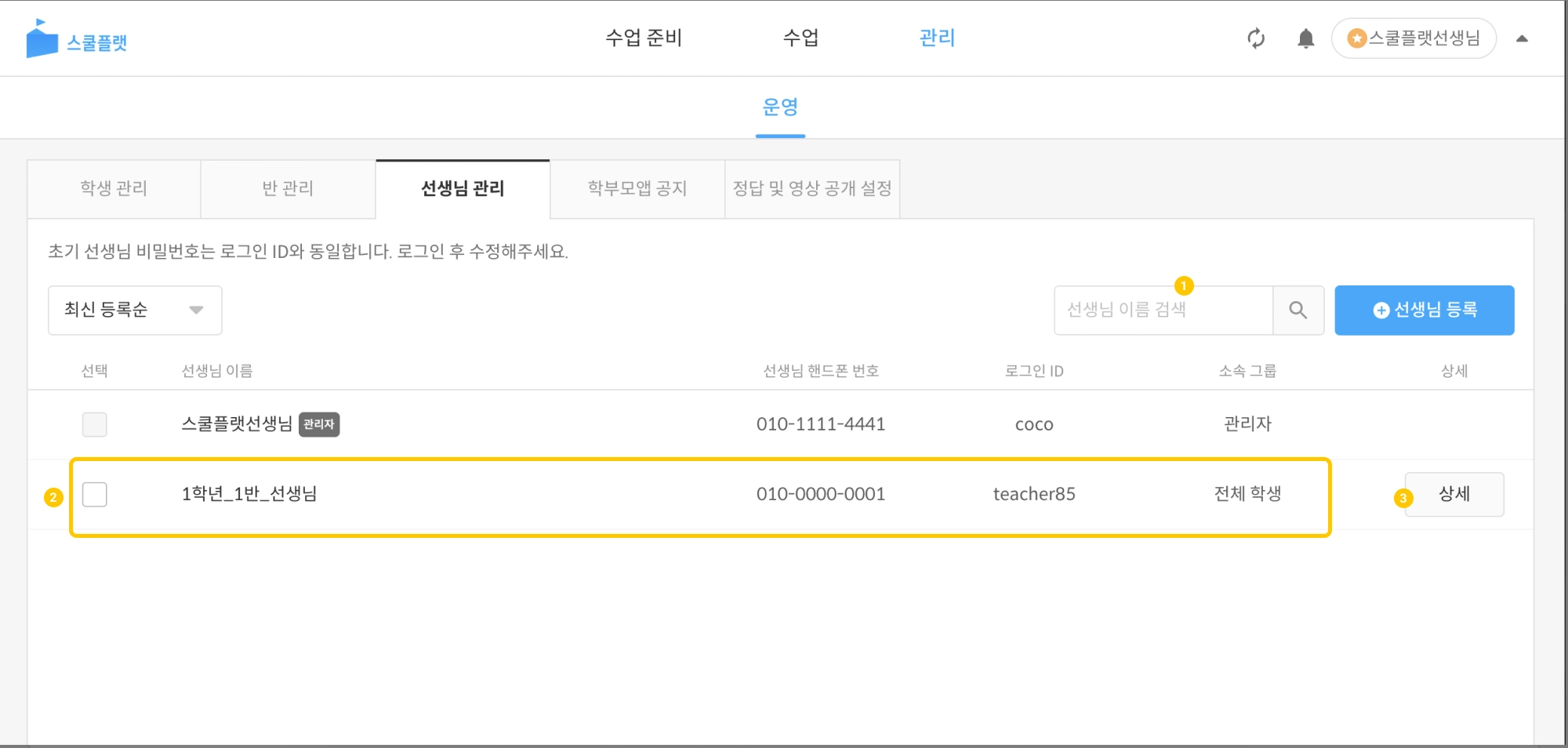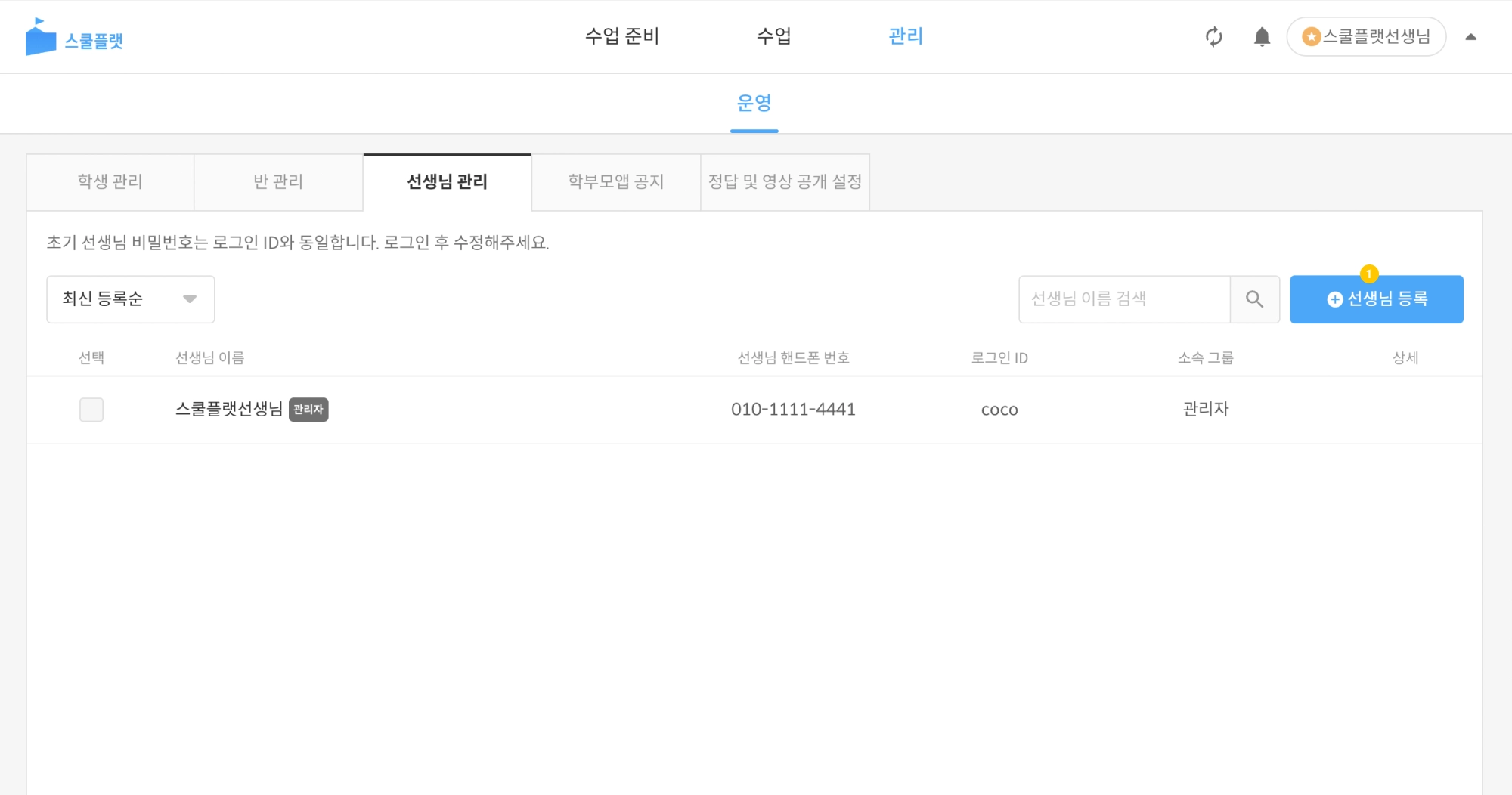 * 선생님 등록 시 초기 패스워드는 ID와 동일합니다.