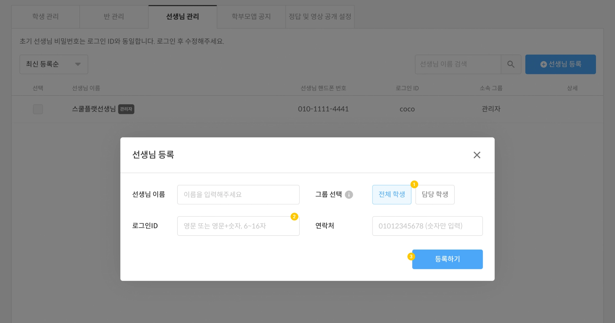 '전체 학생' 선생님, '담당 학생' 선생님을 구분하여 등록할 수 있습니다.