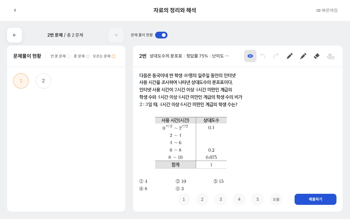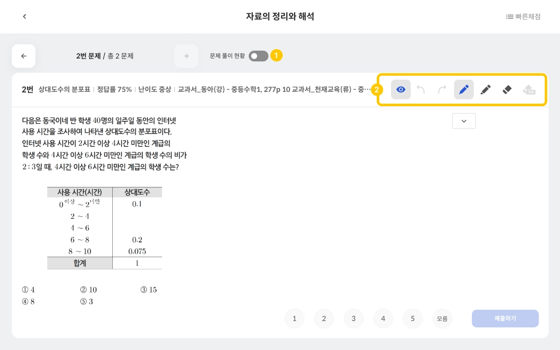 ‘문제 풀이 현황 토글’을 ON하고 현황판을 볼 수 있어요.