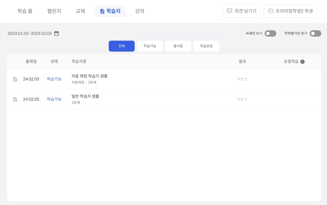 학습지 탭에서 선생님이 출제한 학습지를 선택해서 문제를 풀거나 답안을 입력할 수 있습니다.