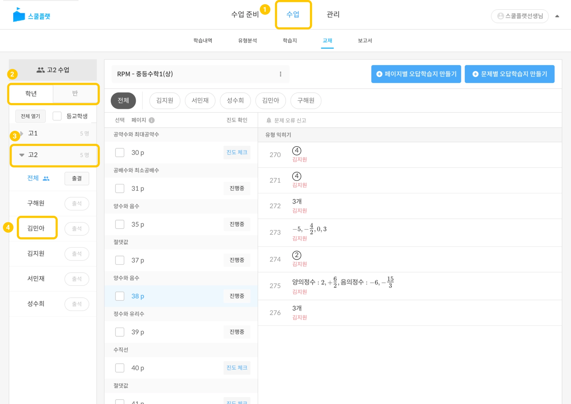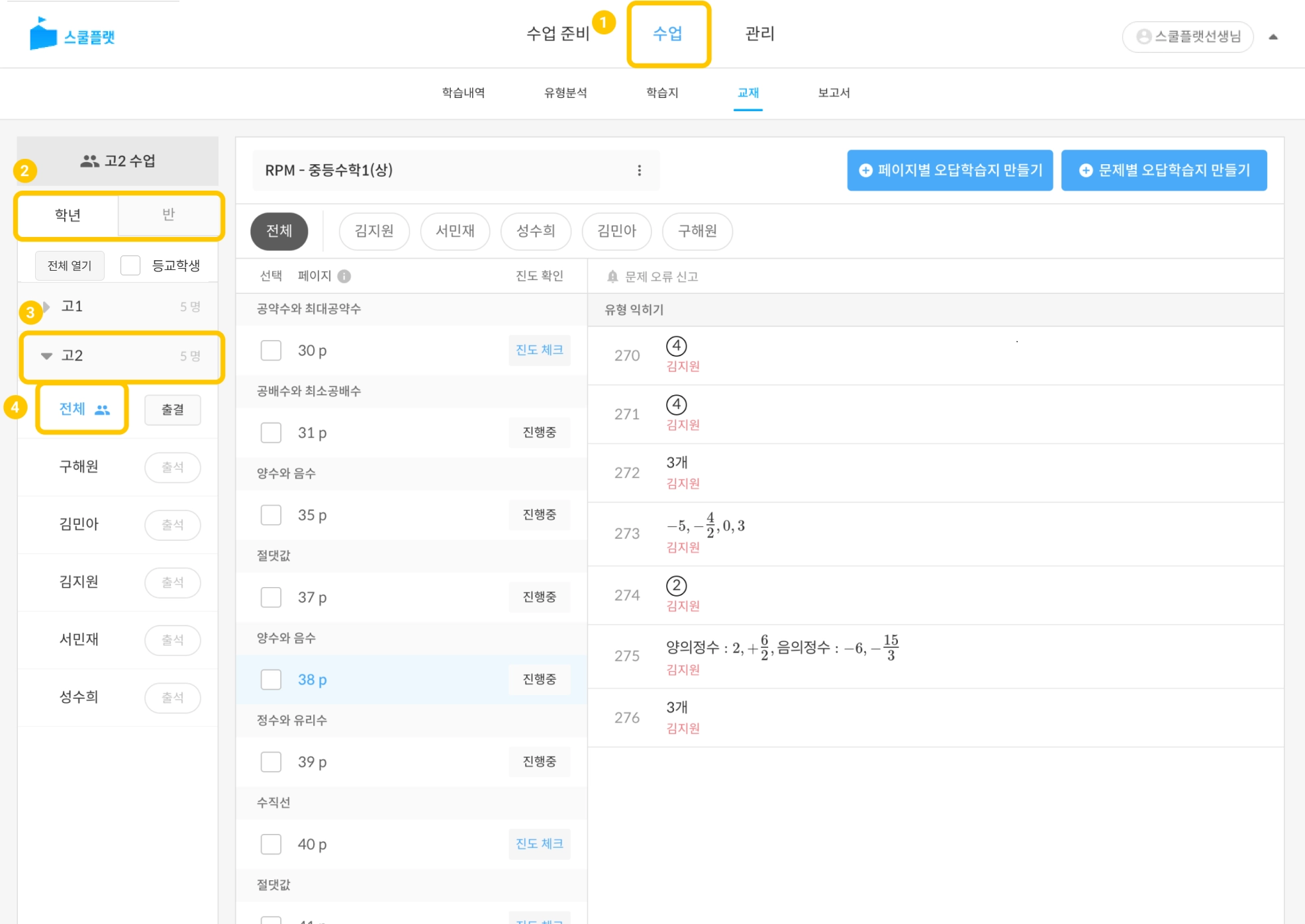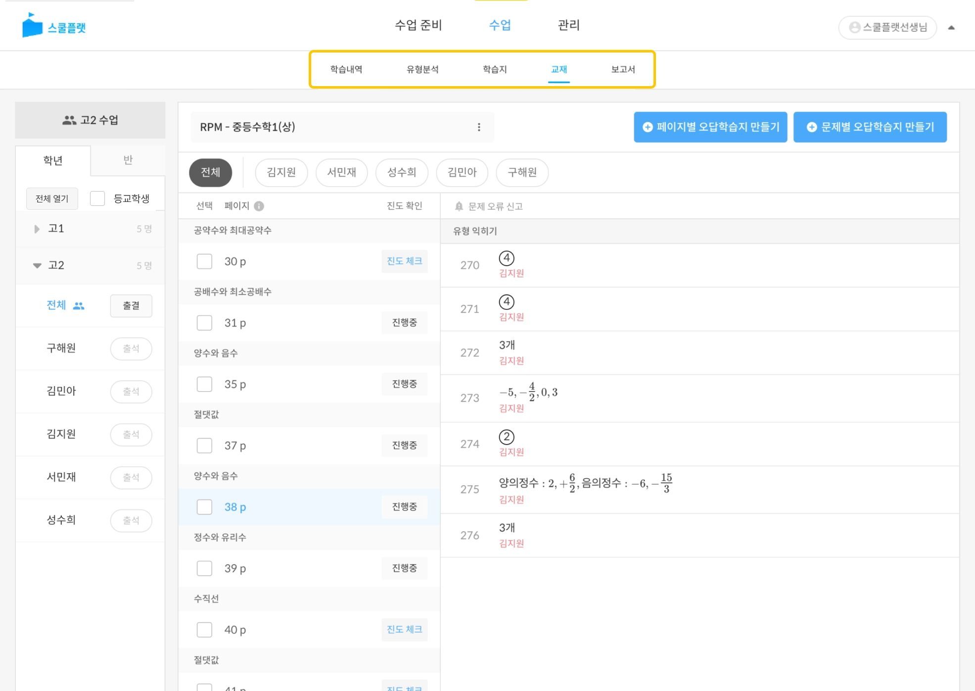 [수업] 탭은 학생들의 학습내역을 확인하고 학생들에게 출제한 학습지 및 교재 채점하고, 채점 기록을 통해 보고서를 만들 수 있는 탭입니다.