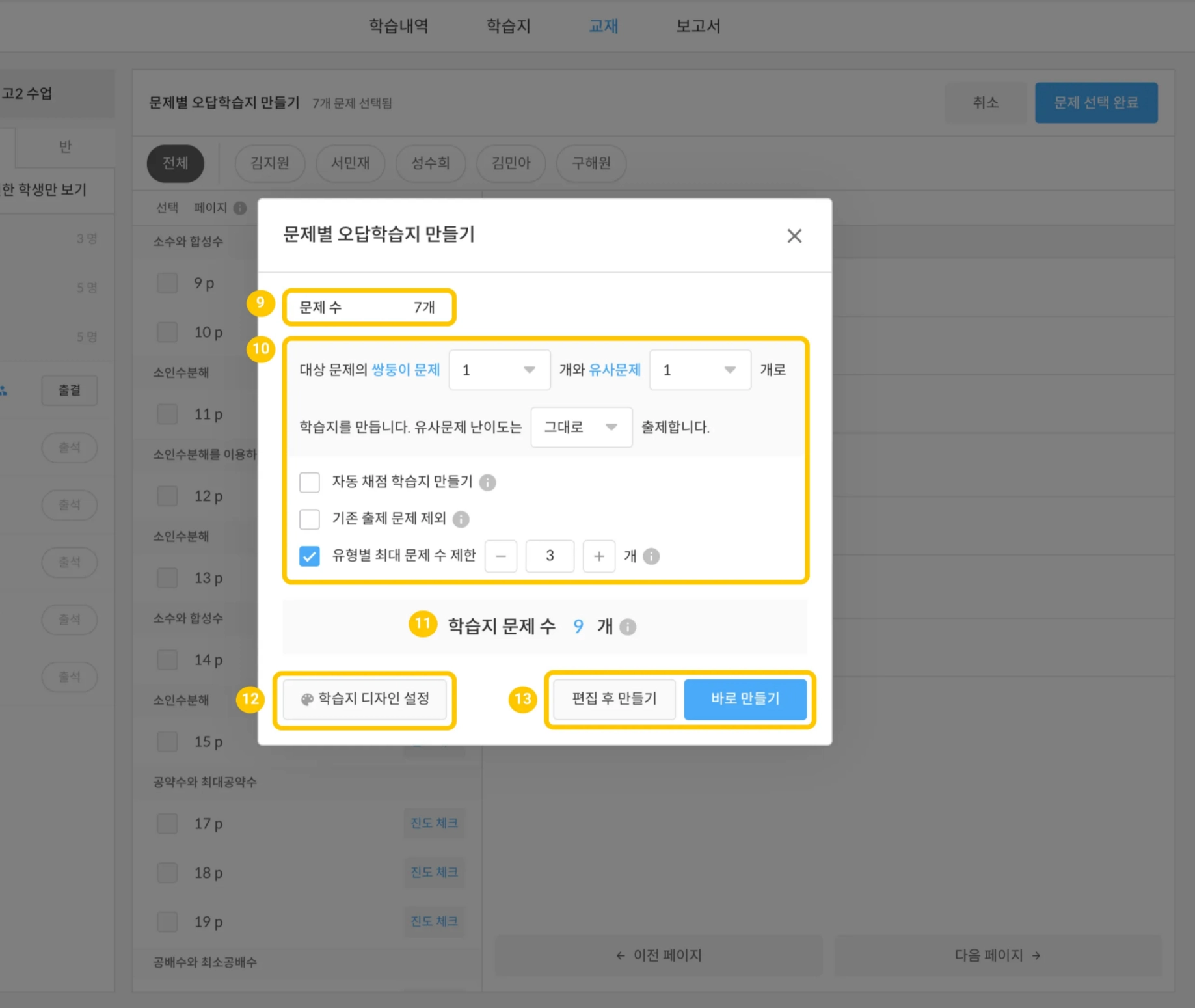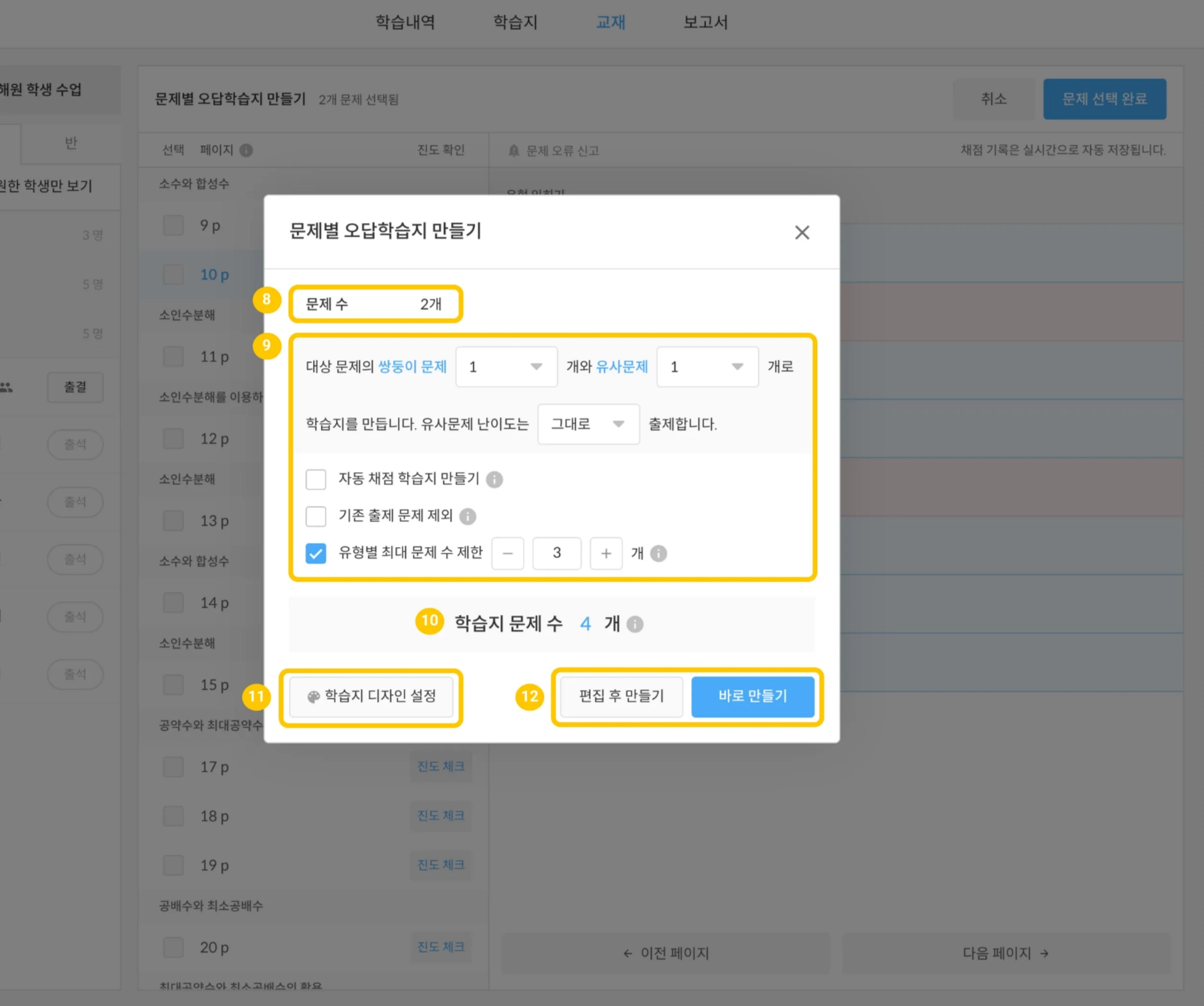 편집 후 만들기 : 학습지 만들기 2단계로 이동되어 오답 학습지에 포함될 문제를 확인 및 편집할 수 있습니다.