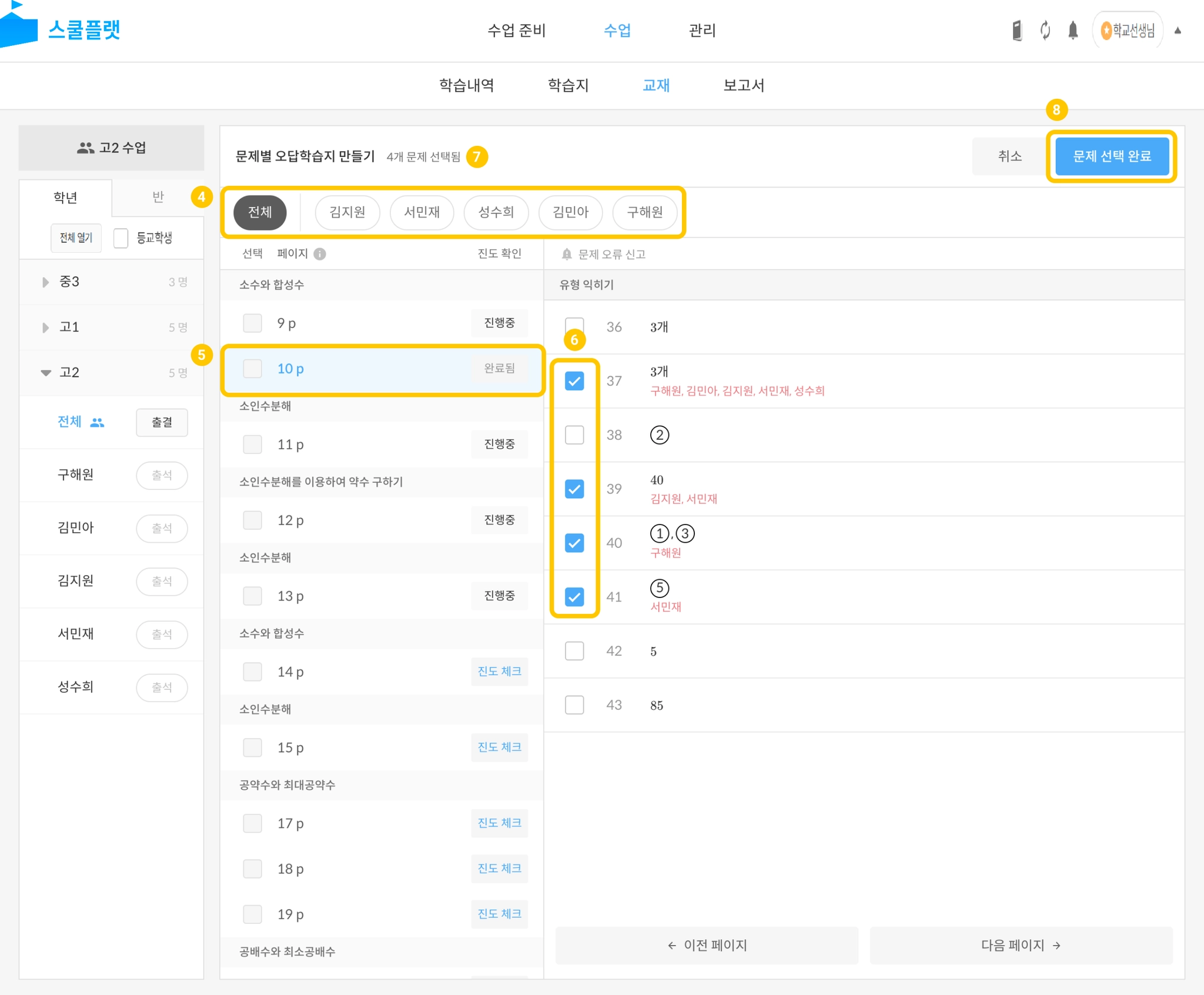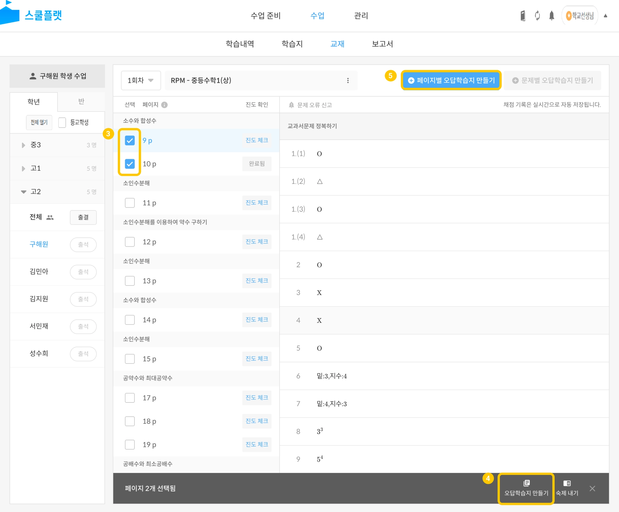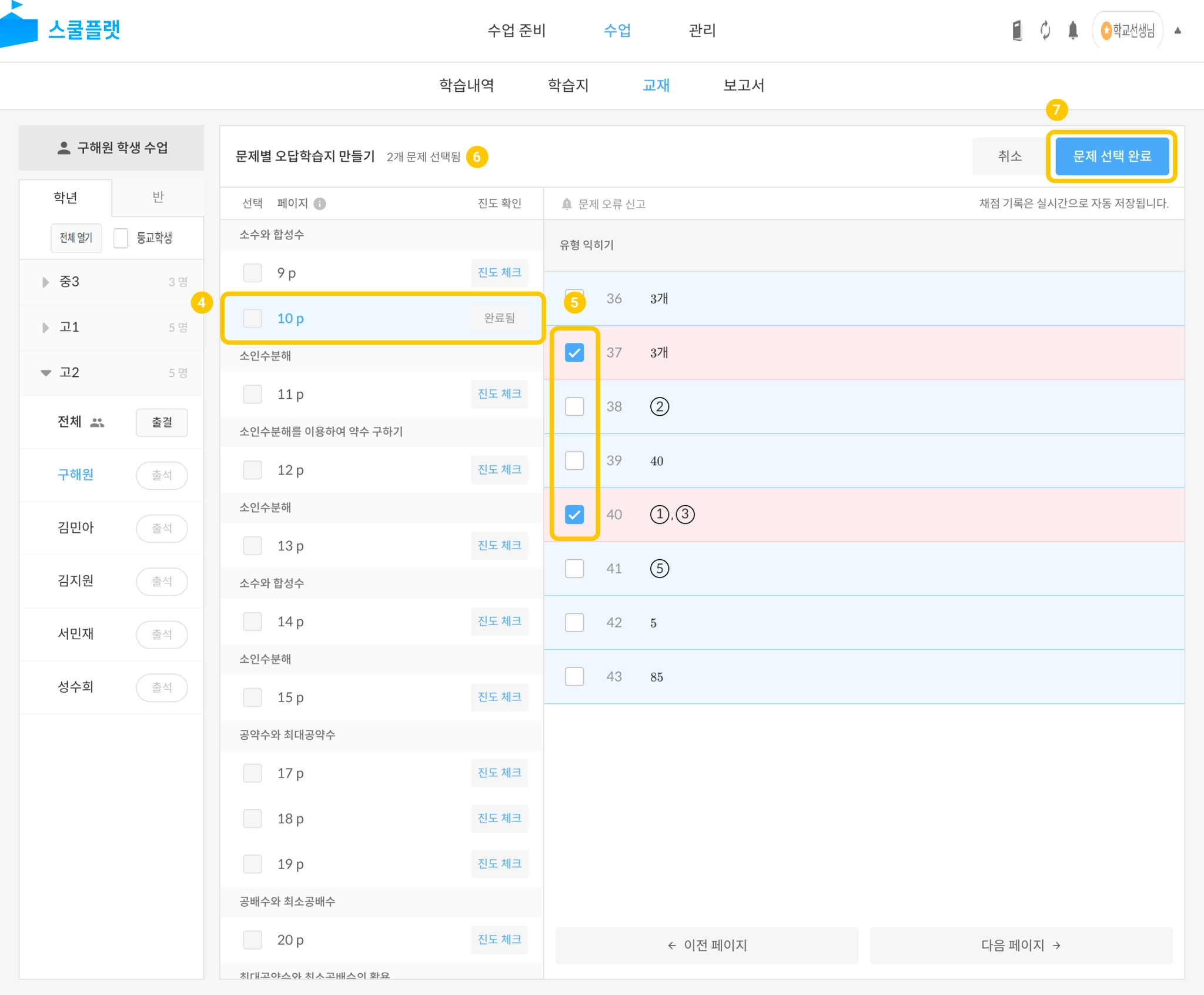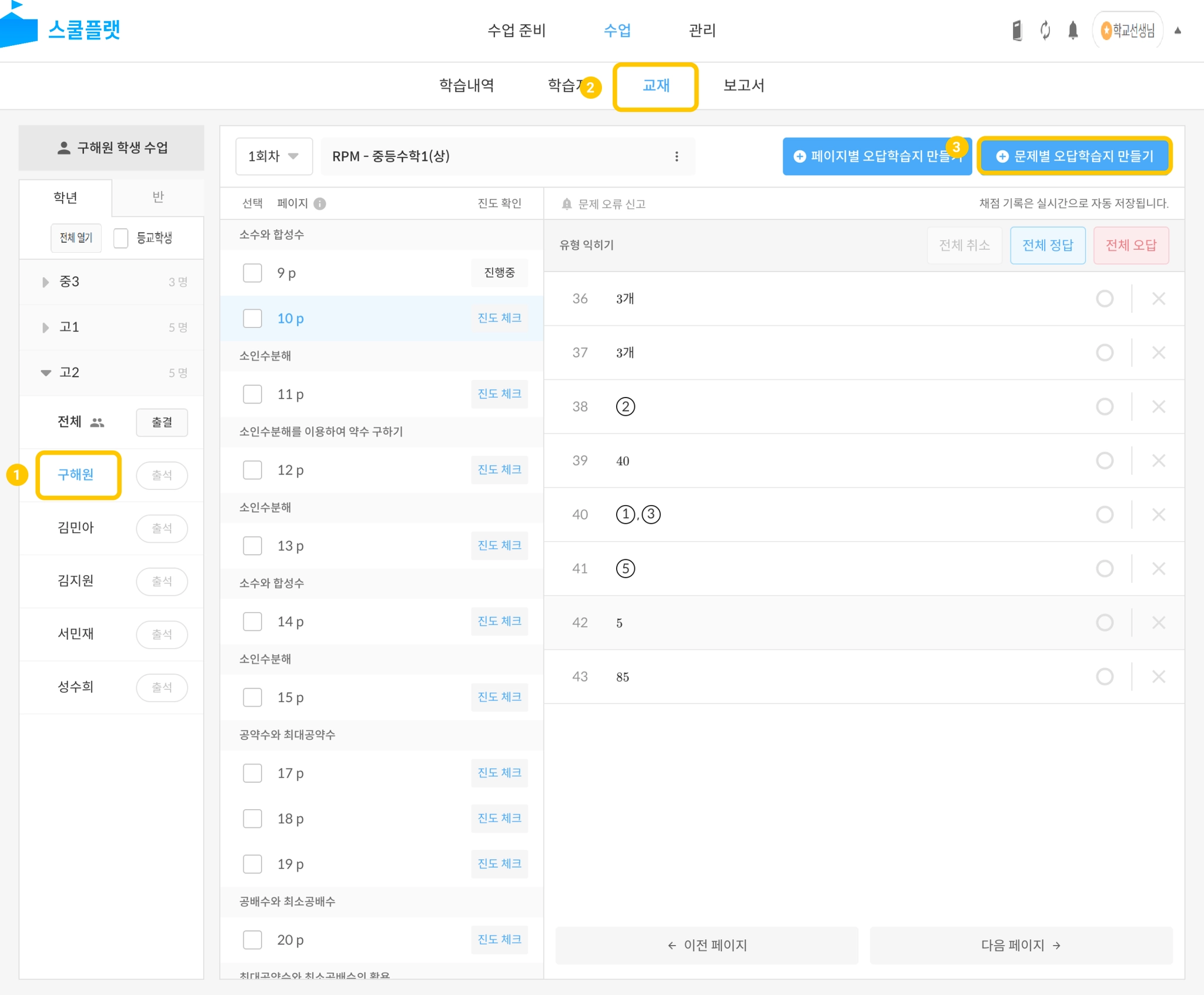 수업 > 학년, 반 또는 학생 선택 > 교재